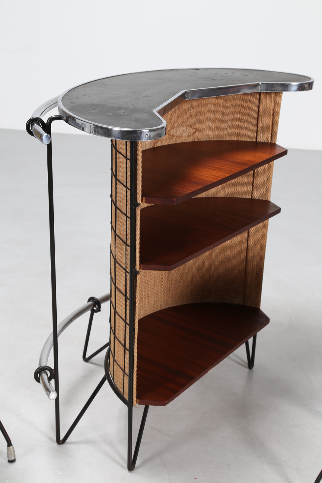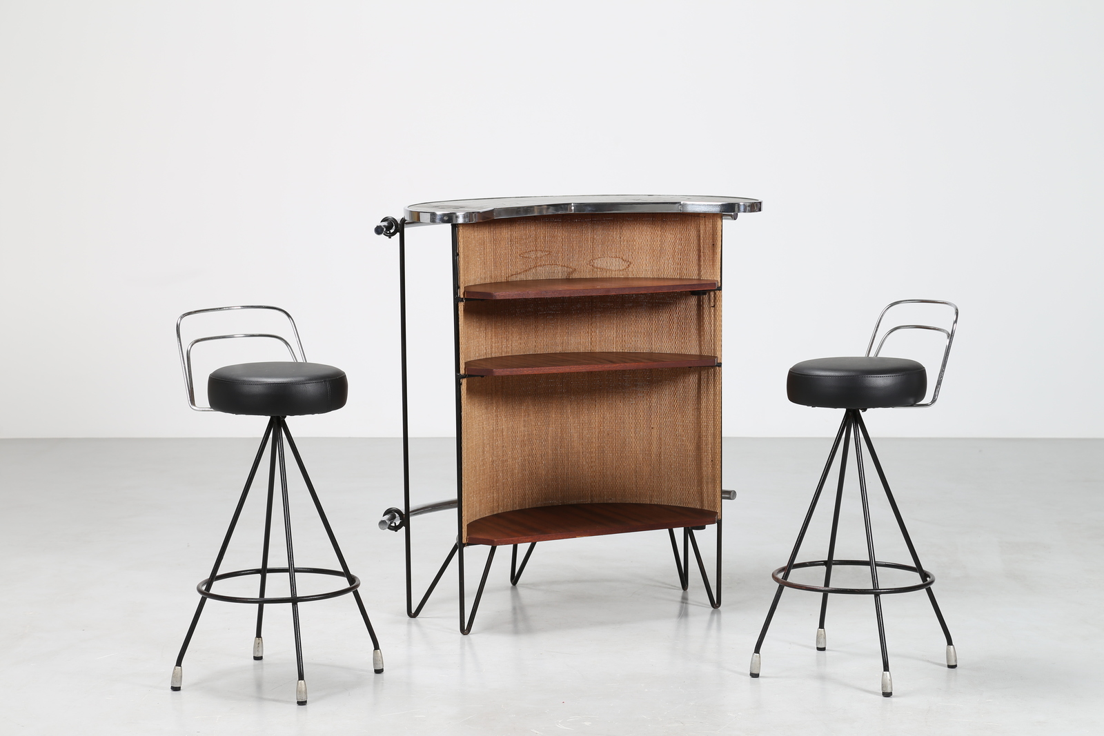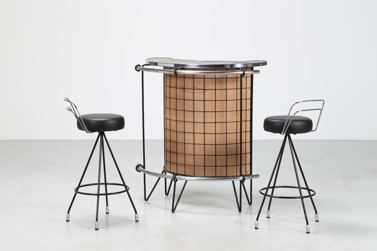 WEINBERG FREDERICK Attrib. Mobile bar e due sgabelli in tondino di ferro...
