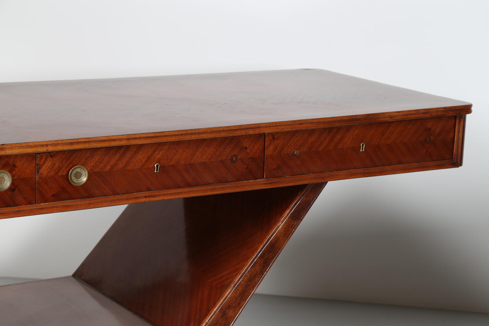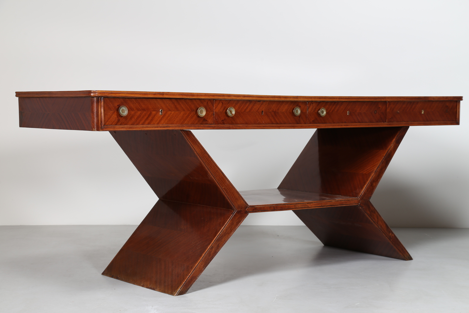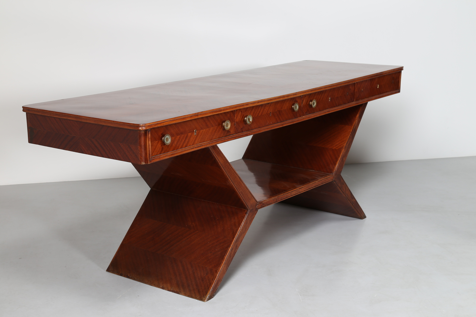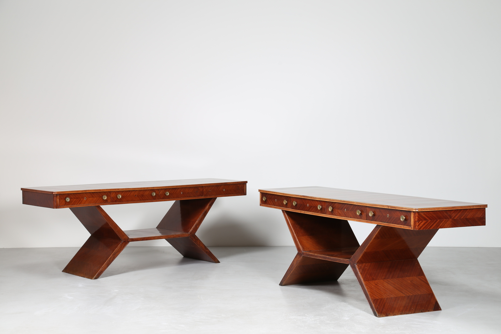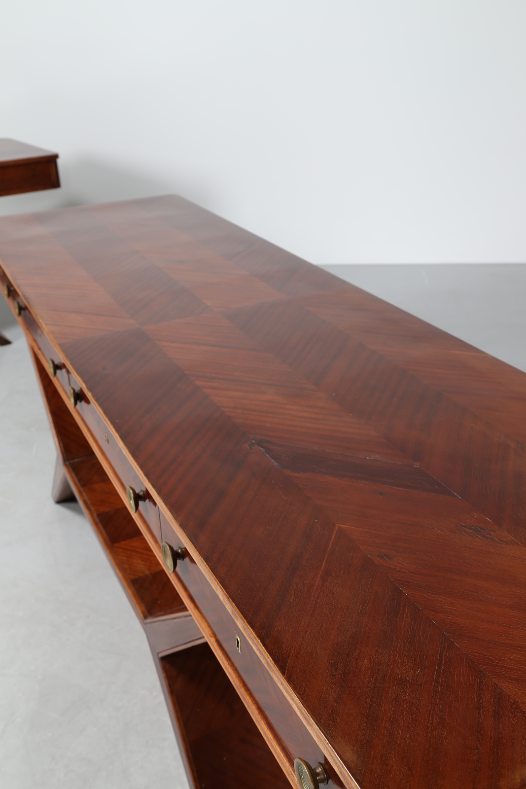 MANIFATTURA ITALIANA Coppia di consolle da centro in mogano e dettagli in ottone, anni 50. -. Cm 232,00 x 87,00 x 68,00.
