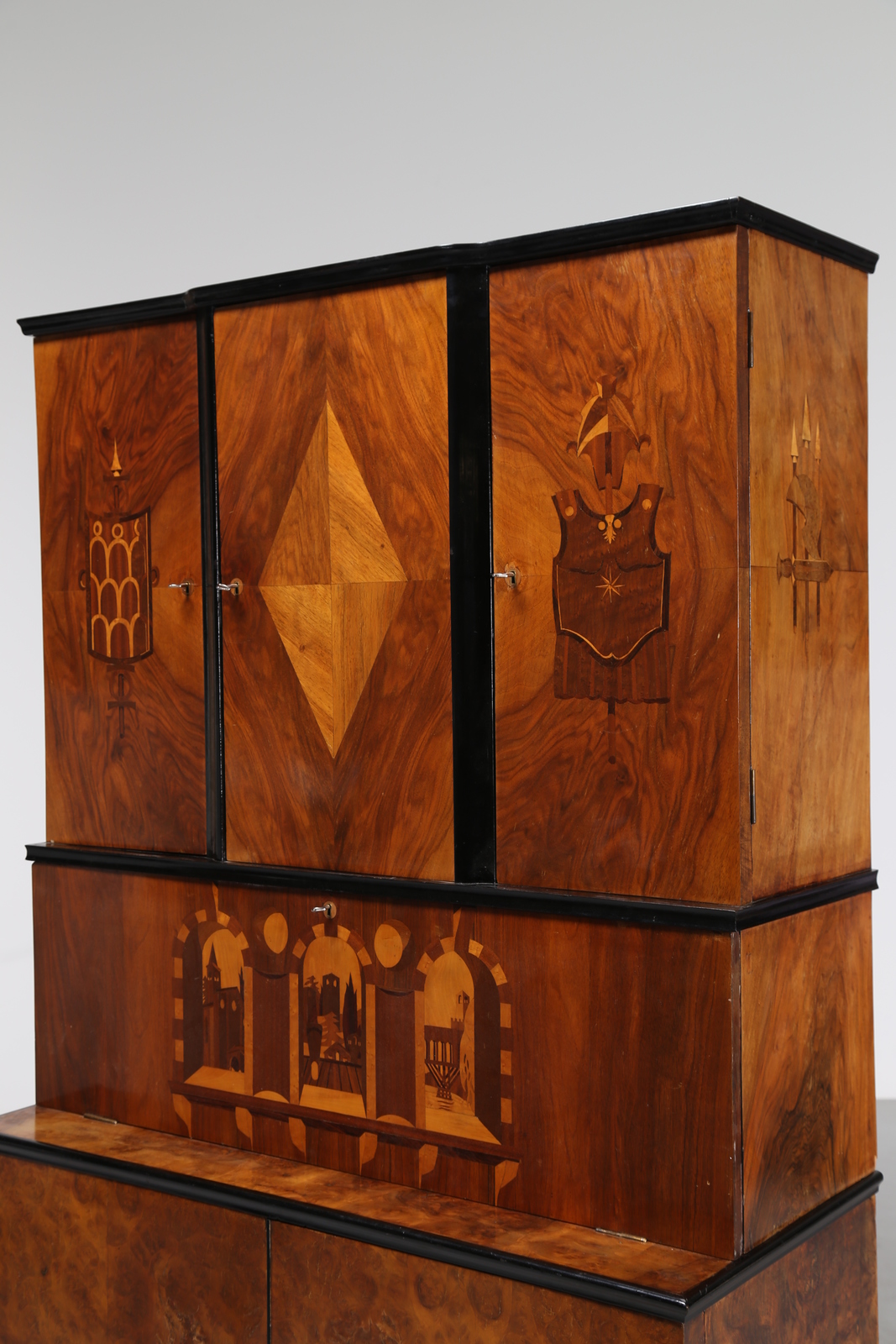 BONFANTI FRANCESCO Attrib. Bureau in legno laccato radica ed intarsi in varie essenze, esecuzione Fratelli Contini Vicenza, anni 50 . Legno. Cm 88,00 x 207,00 x 55,00.