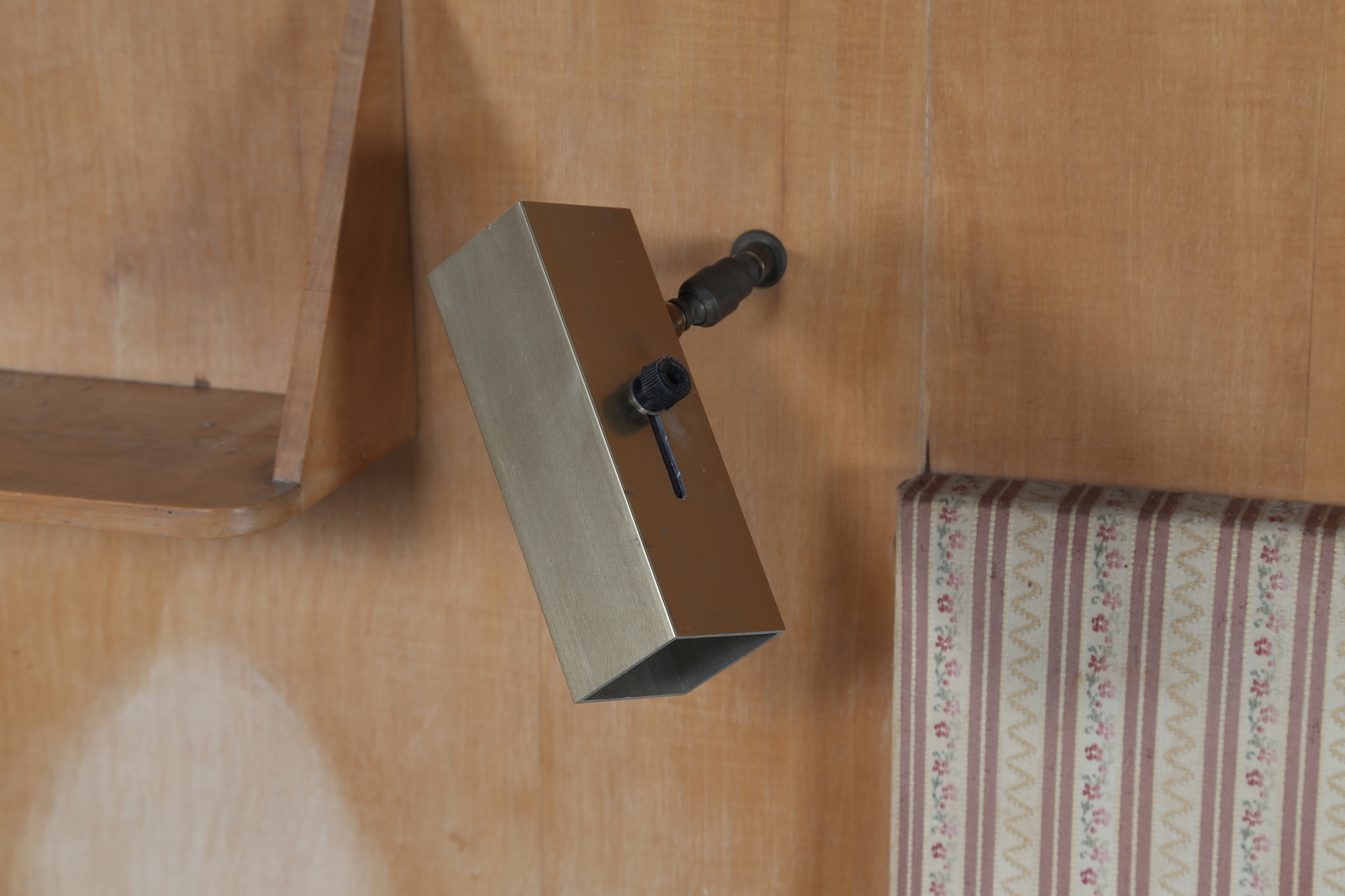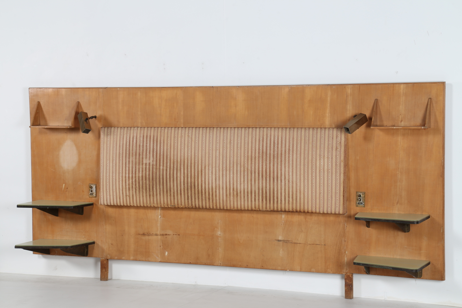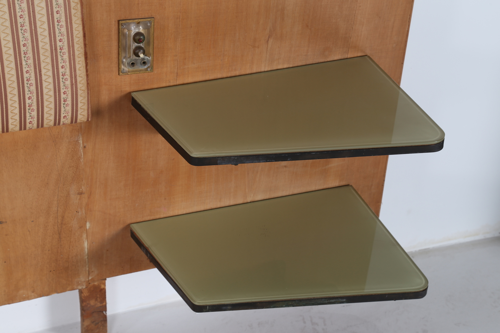 PONTI GIO' (1891 - 1979) Letto matrimoniale in legno e tessuto, piani comodini in cristallo e faretti in ottone, anni 50. Expertice a cura di Salvatore Licitra Archives Gio Ponti Milano. . Cm 302,00 x 137,50 x 36,50.