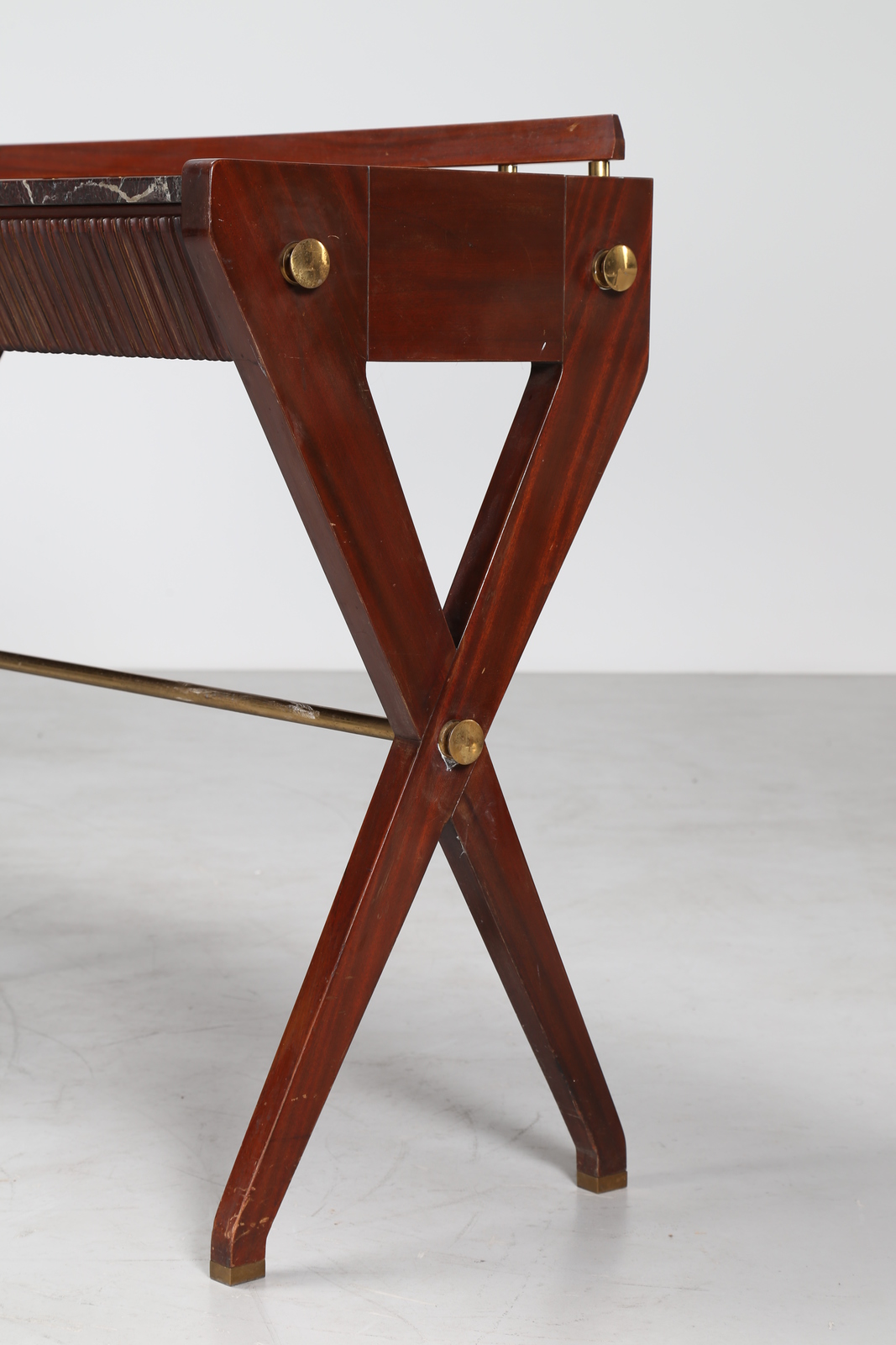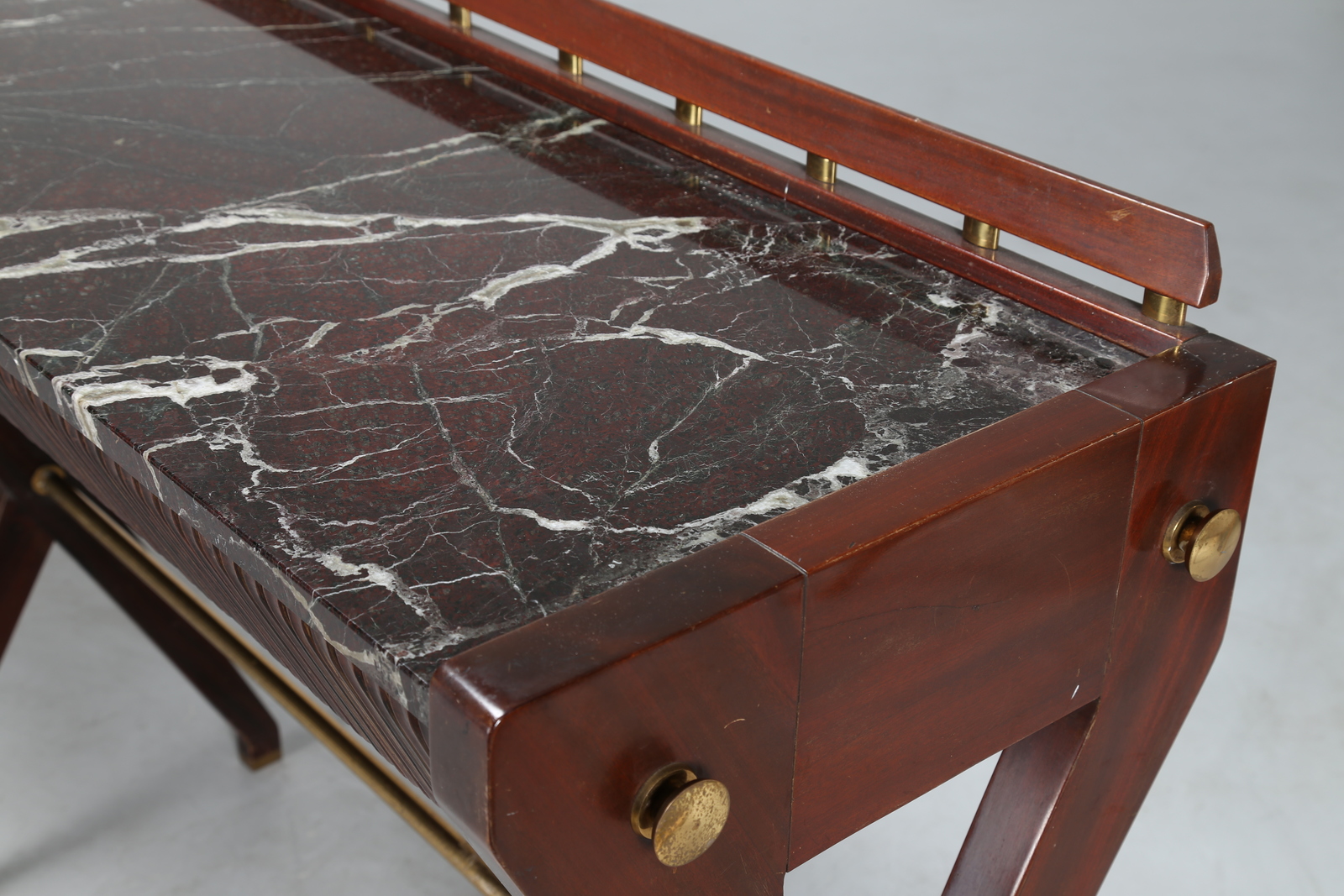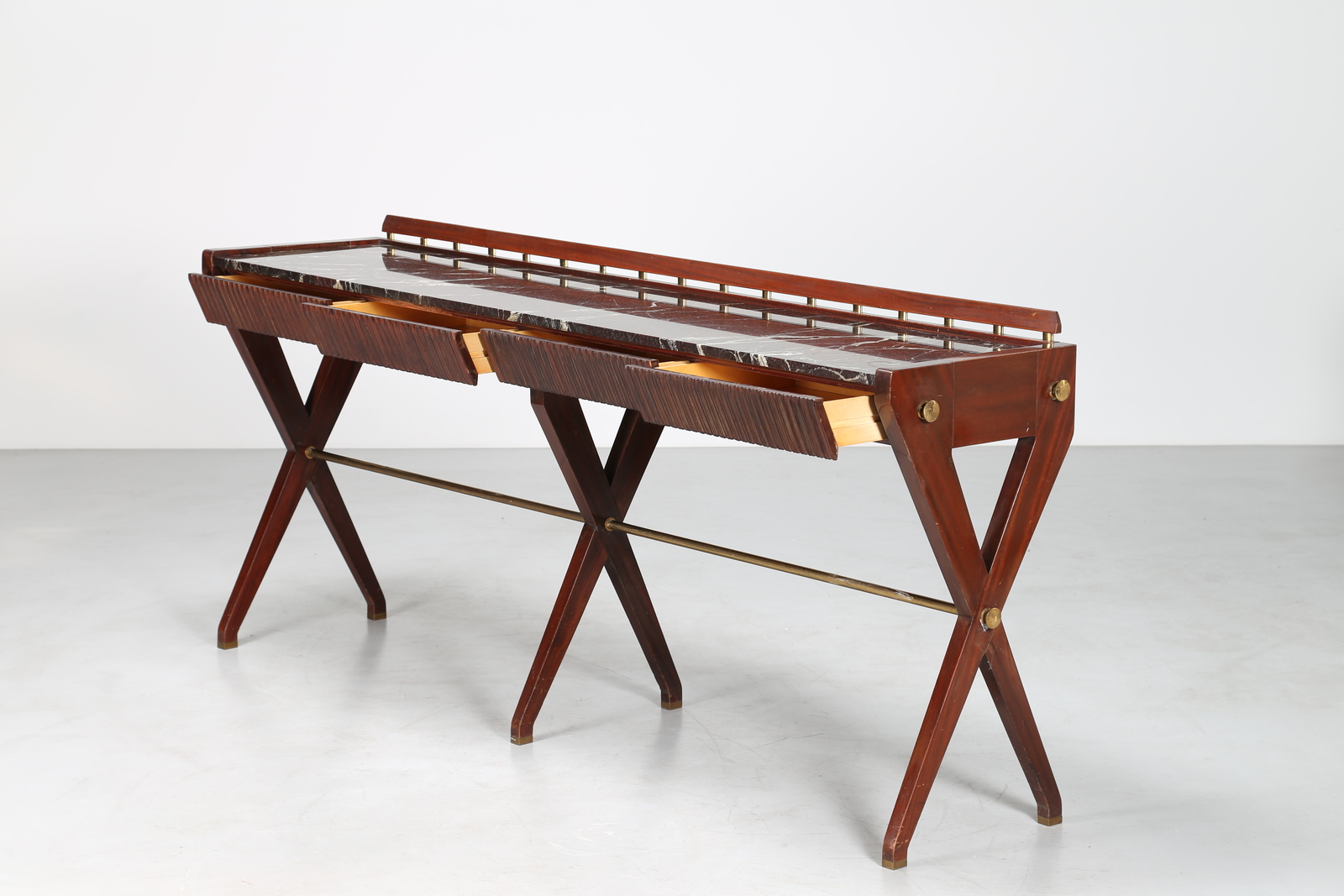 BORSANI OSVALDO (1911 - 1985) Consolle in mogano con cassetti grissinati, piano in marmo e dettagli in ottone, produzione ABV Arredamenti Borsani-Varedo, anni 40. -. Cm 223,00 x 96,50 x 48,00.