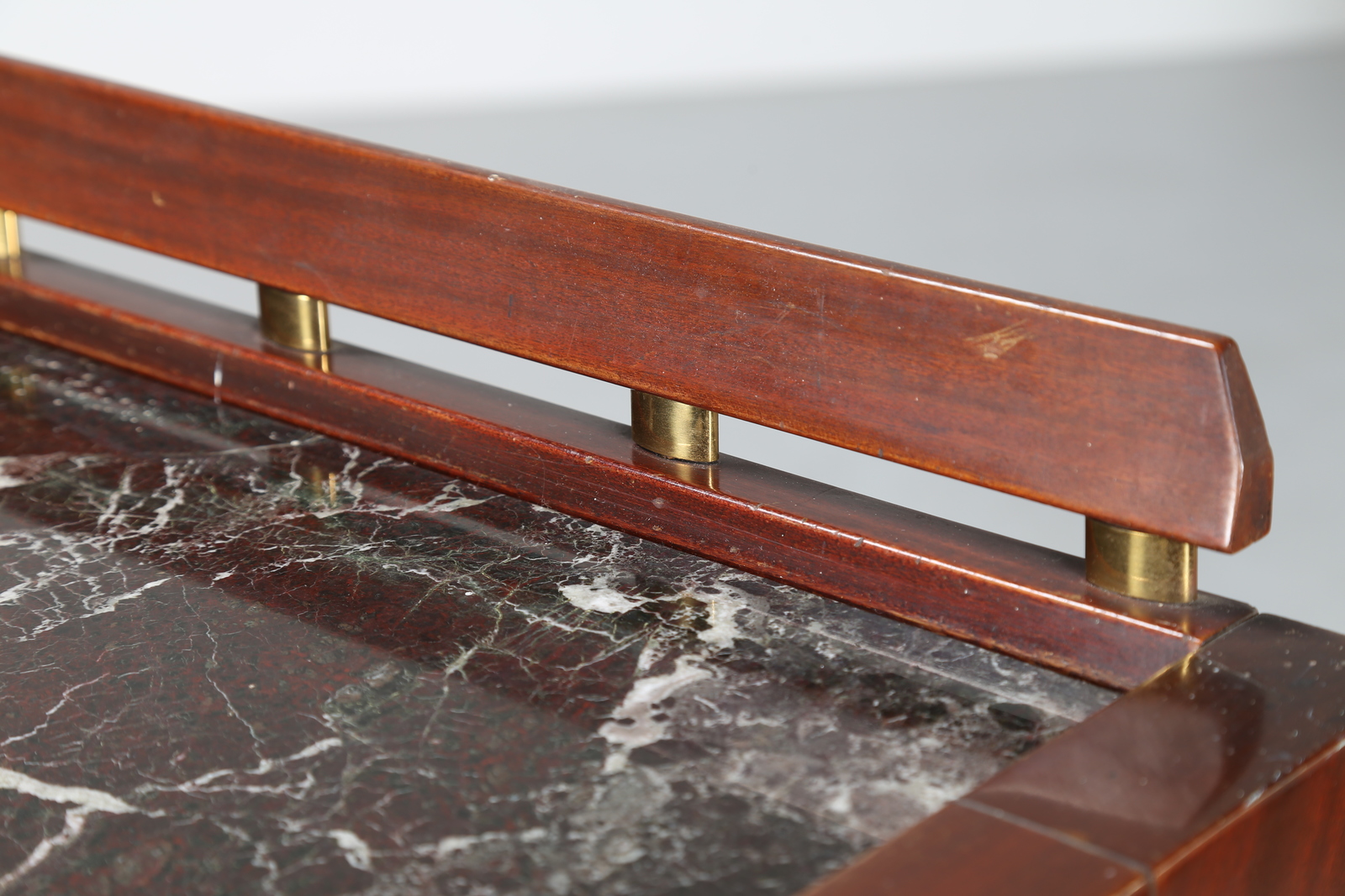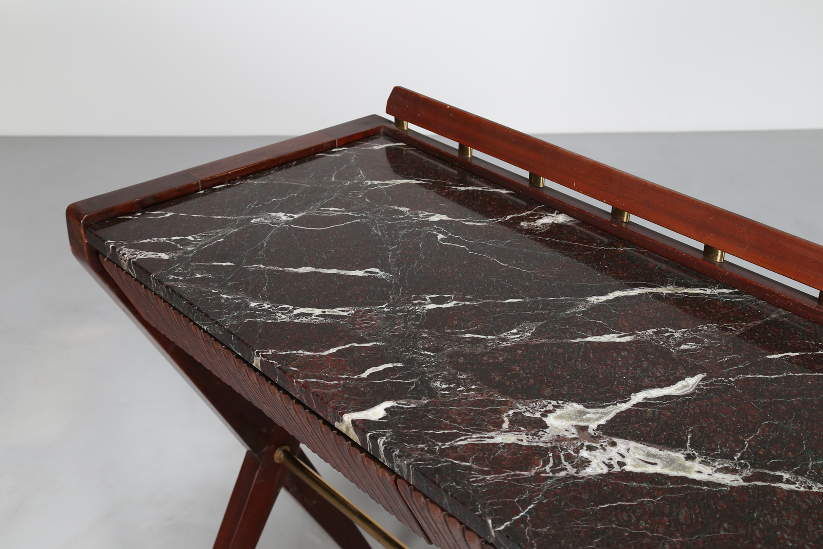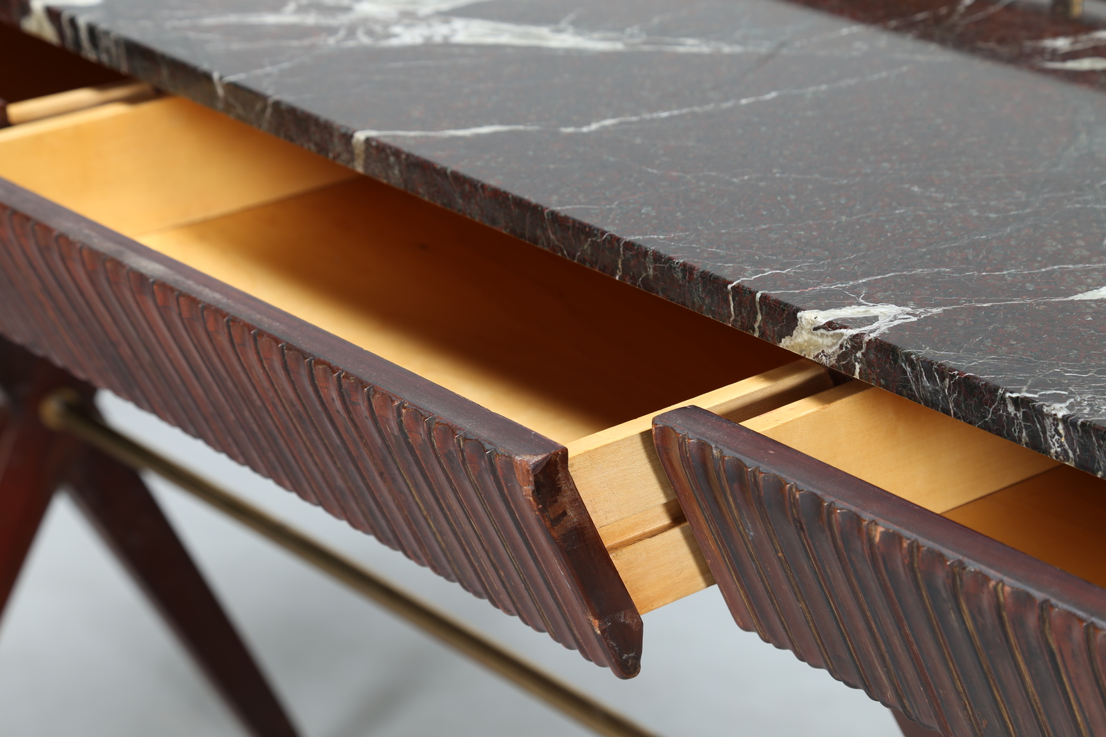 BORSANI OSVALDO (1911 - 1985) Consolle in mogano con cassetti grissinati, piano in marmo e dettagli in ottone, produzione ABV Arredamenti Borsani-Varedo, anni 40. -. Cm 223,00 x 96,50 x 48,00.