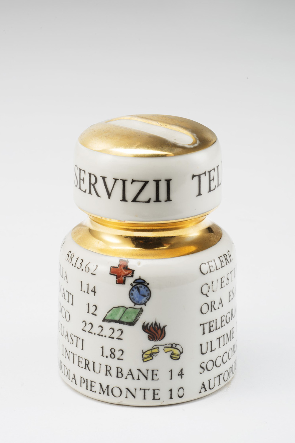 Piero Fornasetti (Milano 1913 - 1988) Fermacarte "Numeri telefonici". Porcellana decorata in oro e policromia. Milano, sec XX (h cm 9) Presse papier "Numeri telefonici". Milan, sec XX (h cm 9)