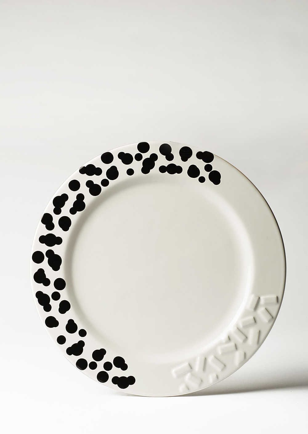 Ettore Sottsass (Innsbruck 1917 - Milano 2007) Piatto modello "Rucola". Produzione Memphis, Milano, 1985. Ceramica smaltata in bianco e nero (d cm 30,4) A plate model "Rucola". Produced by Memphis, Milan, 1985. Glazed ceramic (d cm 30,4)