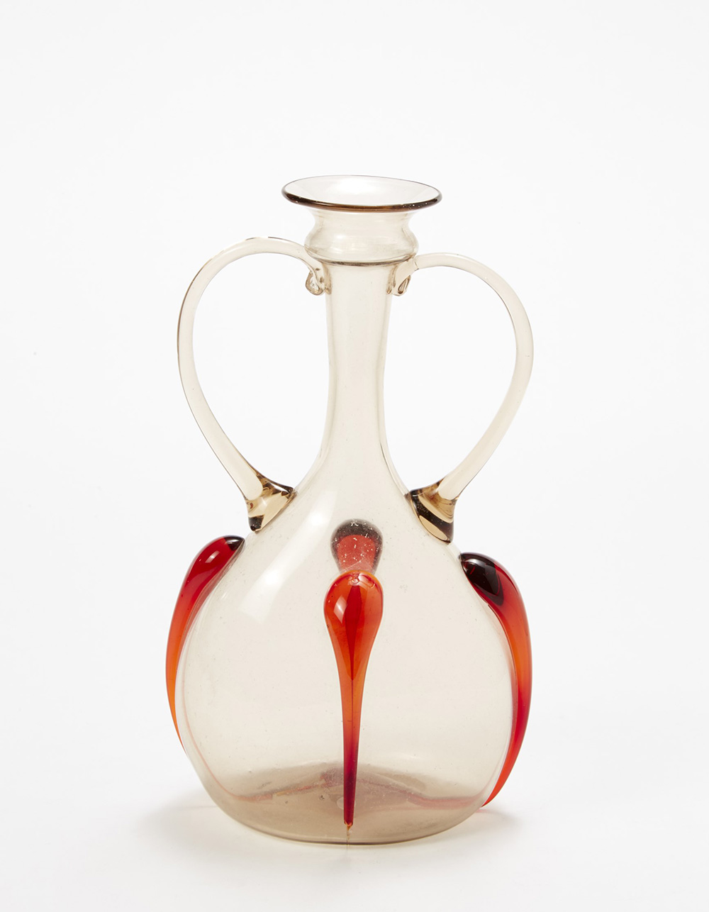 Manifattura di Murano Vaso a bottiglia biansato in vetro soffiato pagliesco chiaro con applicazione in vetro trasparente rosso. Anni 20 (h cm 23) Murano manufacture Bottle vase. Glass. Italy, 1920s (h cm 23)