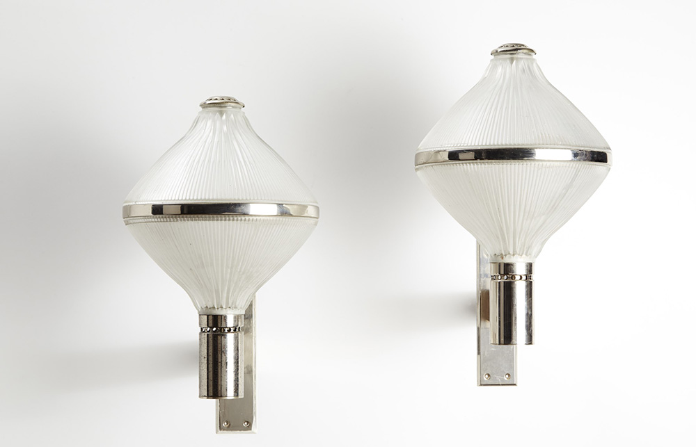 BBPR (Lodovico Barbiano di Belgiojoso, Enrico Peressutti, Ernesto Nathan Rogers) ( ) Coppia di lampade da parete modello "Polimnia". Produzione Artemide, Milano, 1970 ca. Metallo cromato, vetro pressato in stampo (h cm 50) (lievi difetti) A pair of wall lamps model "Polimnia". Produced by Artemide, Milan, circa 1970. Chromed metal, glass (h cm 50) (minor defects)