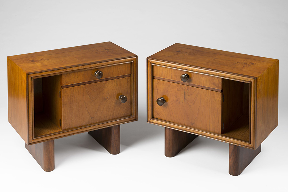 Coppia di comodini in frassino ulivato, profili in mogano massello, piedi impiallacciati in palissandro indiano, pomoli in legno di palma. Esecuzione Marelli & Colico, Cant˘, 1937 (cm 62,5x56x35) A pair of bed talbes. Ash wood, mahogany, veneered Indian rosewood, palm wood. Made by Marelli & Colico, Cant˘, 1937 (cm 62,5x56x35)