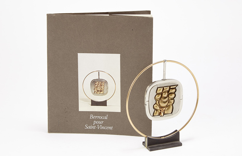 Miguel Berrocal ( 1933 - 2006) Collana con ciondolo raffigurante David. In scatola. Accompagnata da libretto e base espositiva (h del ciondolo cm 7) Necklace with pendant depicting David. With box. Comes with book and base (pendant h cm 7)