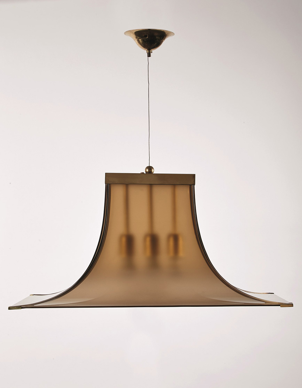 Lampadario a sospensione in ottone e cristallo ambrato curvato e molato. Produzione italiana, fine anni 60 (cm 69x75x51) (lievi difetti) Ceiling lamp. Brass and crystal. Italy, late 1960s (minor defects)