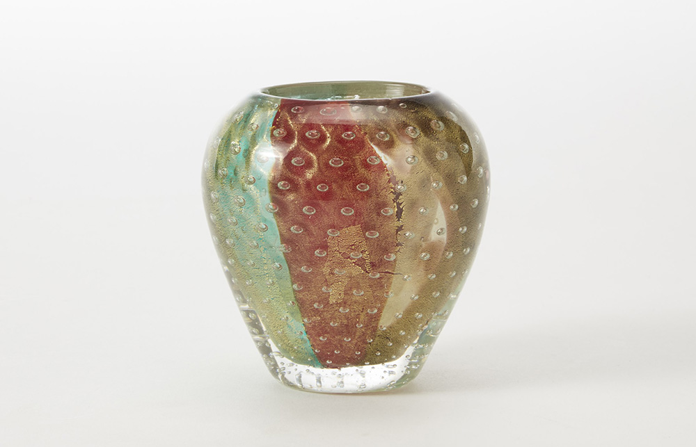 Seguso Vetri d'Arte (attribuito) Piccolo vaso in vetro sommerso bulicante policromo a spicchi, con foglia d'oro. Murano anni 50 (h cm 9) Little glass vase with golden leaf. Murano, 1950s (h cm 9)