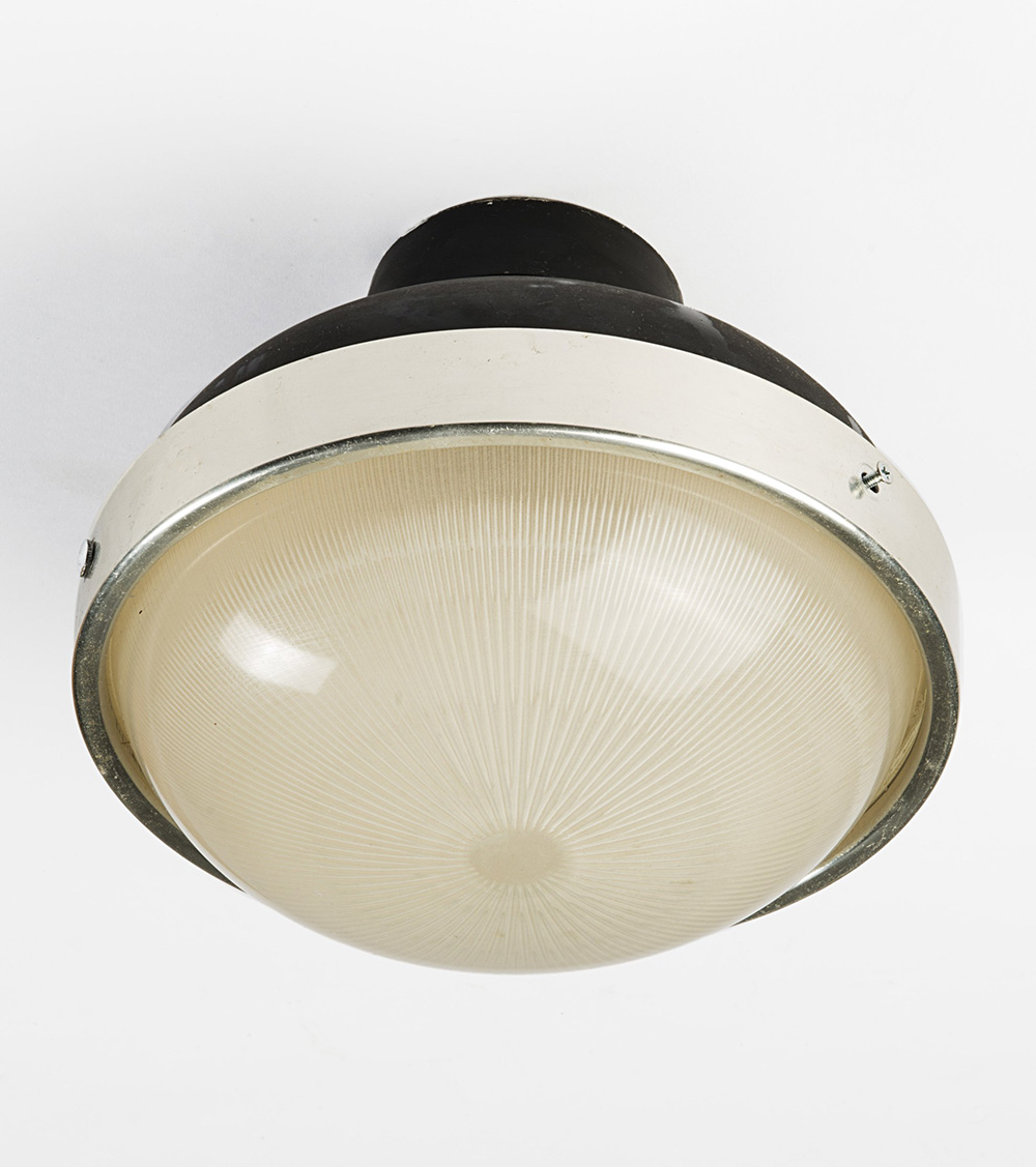 Gino Sarfatti ( 1912 - 1985) Plafoniera modello "3027/G". Produzione Arteluce, Milano, 1960, esemplare del 1970 ca. Struttura in alluminio verniciato nero e cromato, diffusore in vetro prismatico stampato (d cm 27) (difetti e sostituzioni) Bibliografia: M. Romanelli, S. Severi, Gino Sarfatti. Opere scelte 1938-1973, Silvana Editoriale, Cinisello Balsamo 2012, p. 484 Ceiling light model "3027/G". Produced by Arteluce, Milan, 1960, made circa 1970. Aluminium, glass (d cm 27) (defects and replacements) Bibliography: M. Romanelli, S. Severi, Gino Sarfatti. Opere scelte 1938-1973, Silvana Editoriale, Cinisello Balsamo 2012, p. 484