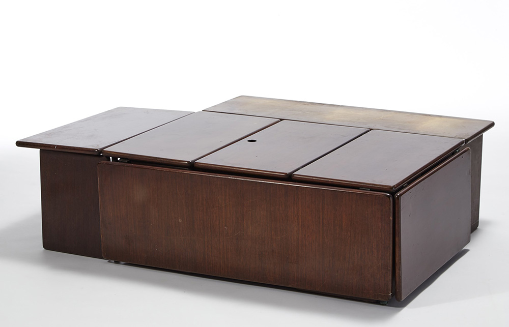 Vico Magistretti (Milano 1920 - Milano 2006) Prototipo per tavolo basso-mobile bar. Legno impiallacciato e bordato in palissandro indiano. Milano anni 60. Esemplare unico eseguito su disegno per la famiglia dell'architetto (cm 100x38x66) Provenienza: collezione privata, Milano Accompagnato da certificazione di autenticit‡ e provenienza della Fondazione Vico Magistretti Low table/cocktail cabinet prototype. Veneered wood and Indian rosewood. Milan, 1960s. One of a kind made for the designer's family (cm 100x38x66) Provenance: private collection, Milan Comes with the certificate of authenticity issued by the Vico Magistretti Foundation