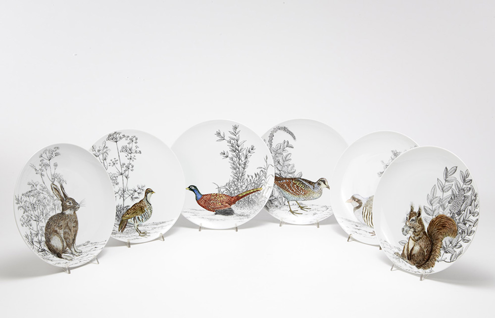 Piero Fornasetti (Milano 1913 - 1988) Lotto composto da sei piatti in porcellana della serie "Selvaggina", dipinti in policromia con figure di animali. Marcati e numerati da 1 a 6 al verso (d cm 26) Six plates from the "Selvaggina" series. Marked and numbered from 1 to 6 (d cm 26)