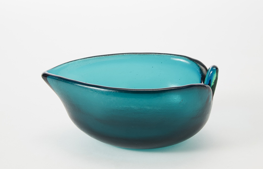 Tyra Lundgren (1897-1979) (attribuito) ( 1897 - 1979) Foglia in vetro trasparente verde e blu di grosso spessore, corroso all'acido sulla superficie esterna. Venini, Murano disegno del 1937, esecuzione anni 40. Disegno 2643 del Catalogo Blu Venini (cm 14x19 x h cm 9) Bibliografia: Paolo Venini e la sua fornace, a cura di M. Barovier e C. Sonego, Skira, Milano 2016, p. 366 Glass leaf. Venini, Murano, designed 1937, produced 1940s. Design 2643 (Catalogo Blu Venini) (cm 14x19 x h cm 9) Bibliography: Paolo Venini e la sua fornace, a cura di M. Barovier e C. Sonego, Skira, Milano 2016, p. 366