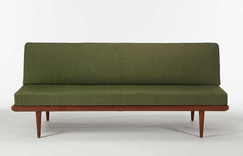 Peter Hvidt e Orla M¯lgaard-Nielsen Divano modello "Minerva FD417". Produzione France & Daverkosen, Danimarca, 1957 ca. Struttura in teak massello e metallo brunito, seduta e schienale rivestiti in tessuto verde. Marchio "Fd" su placchetta metallica (cm 188x77x76) (lievi difetti) Sofa. Teak and green fabric. Danish manufacture, 1950s (cm 188x77x76) (minor defects)