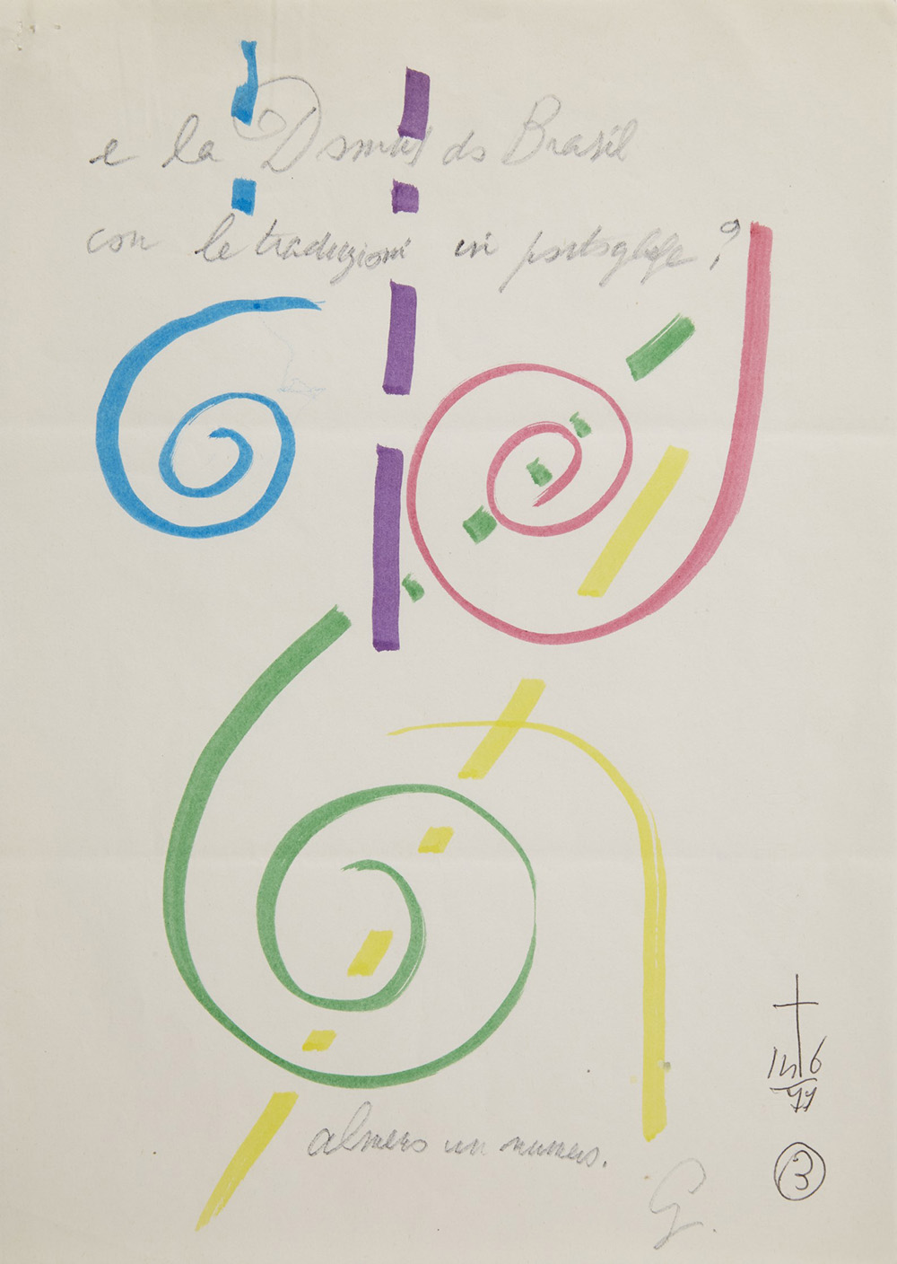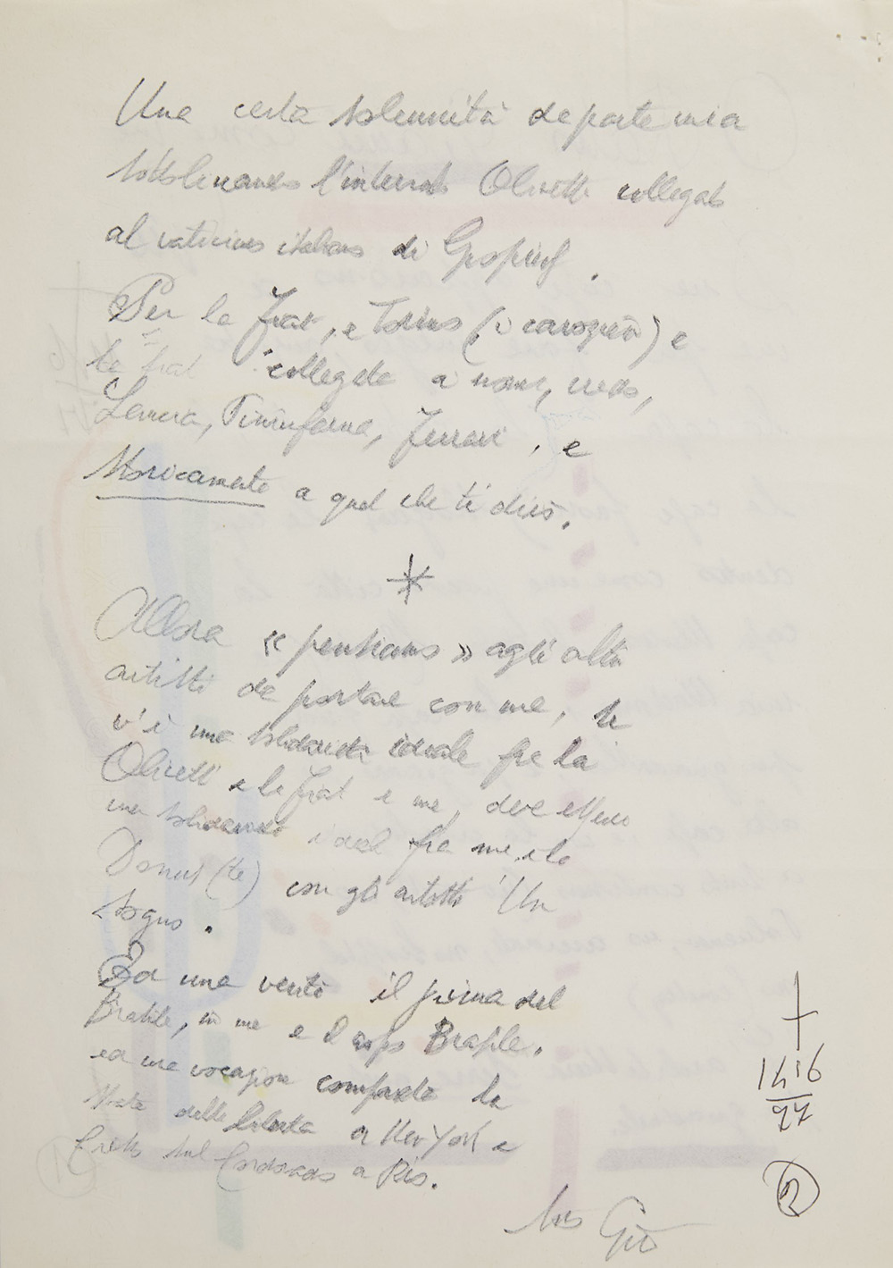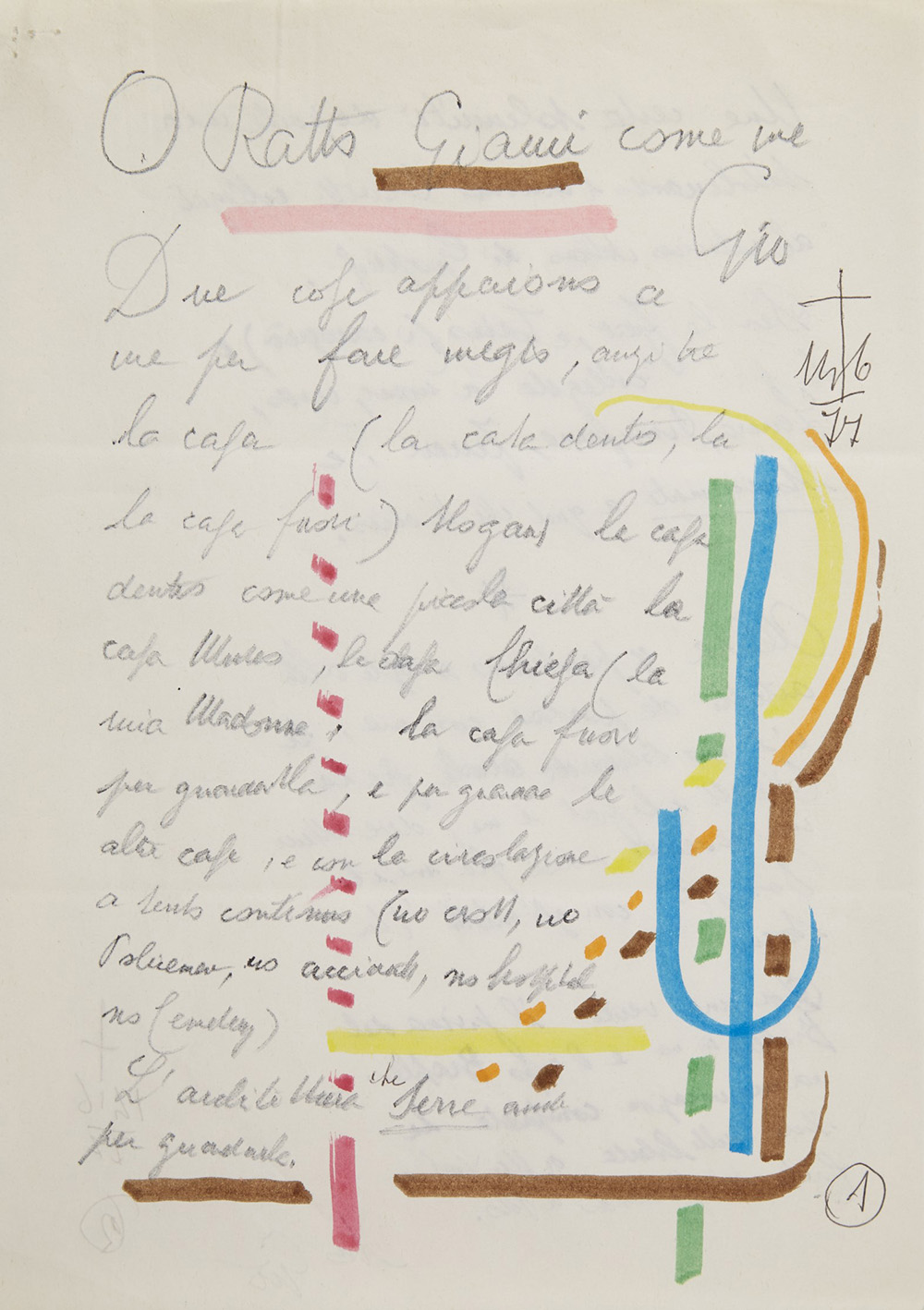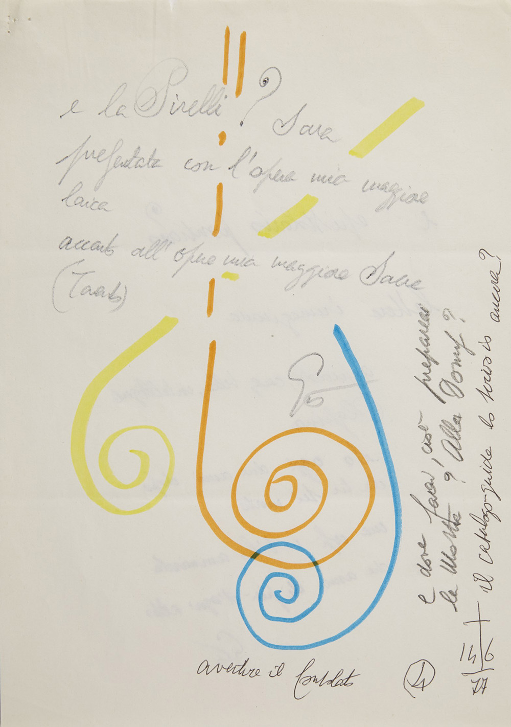 Gio Ponti (Milano 1891 - 1979) Lettera autografa con disegni policromi, inviata a Giovanni Ratto, membro della redazione della rivista "Domus". Composta da quattro fogli numerati, non locata [ma Milano], datata 14/06/1977. Inchiostro nero e pennarelli colorati su carta (cm 29,7x21) Provenienza: collezione privata, Milano Autograph letter with polychrome drawings for Giovanni Ratto, member of "Domus" magazine. Four sheets (cm 29,7x21) Provenance: private collection, Milano