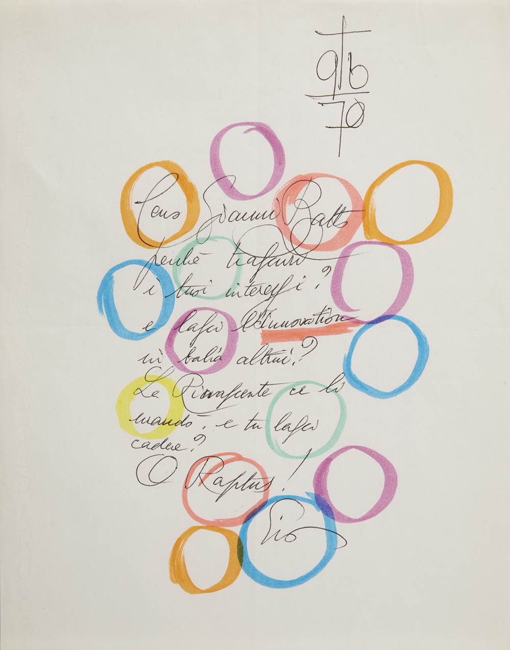 Gio Ponti (Milano 1891 - 1979) Lettera autografa con disegni policromi, inviata a Giovanni Ratto, membro della redazione della rivista "Domus". Non locata, datata 09/06/1970. Inchiostro nero e pennarelli colorati su carta (cm 29,7x21) Provenienza: collezione privata, Milano Autograph letter with polychrome drawings for Giovanni Ratto, member of "Domus" magazine (cm 29,7x21) Provenance: private collection, Milano