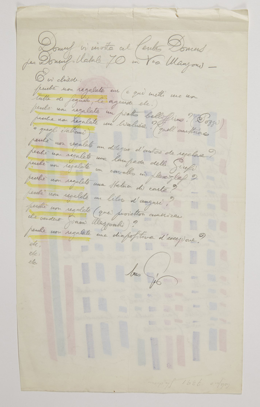 Gio Ponti (Milano 1891 - 1979) Lettera autografa con disegni policromi, inviata a Giovanni Ratto, membro della redazione della rivista "Domus". Non locata, datata 7/10/1970. Matita e pennarelli colorati su carta, recto-verso (cm 31x18,4) Provenienza: collezione privata, Milano Autograph letter with polychrome drawings for Giovanni Ratto, member of "Domus" magazine (cm 31x18,4) Provenance: private collection, Milano