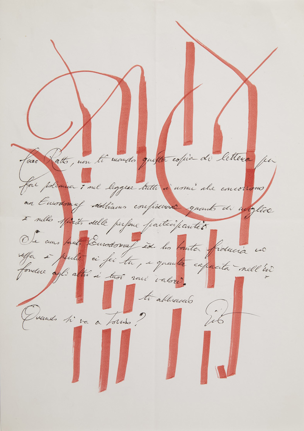 Gio Ponti (Milano 1891 - 1979) Lettera autografa con disegni monocromi, inviata a Giovanni Ratto, membro della redazione della rivista "Domus". Non locata, non datata [1969-70]. Inchiostro nero e pennarello magenta su carta (cm 29,7x21) Provenienza: collezione privata, Milano Autograph letter with monochrome drawings for Giovanni Ratto, member of "Domus" magazine (cm 29,7x21) Provenance: private collection, Milano