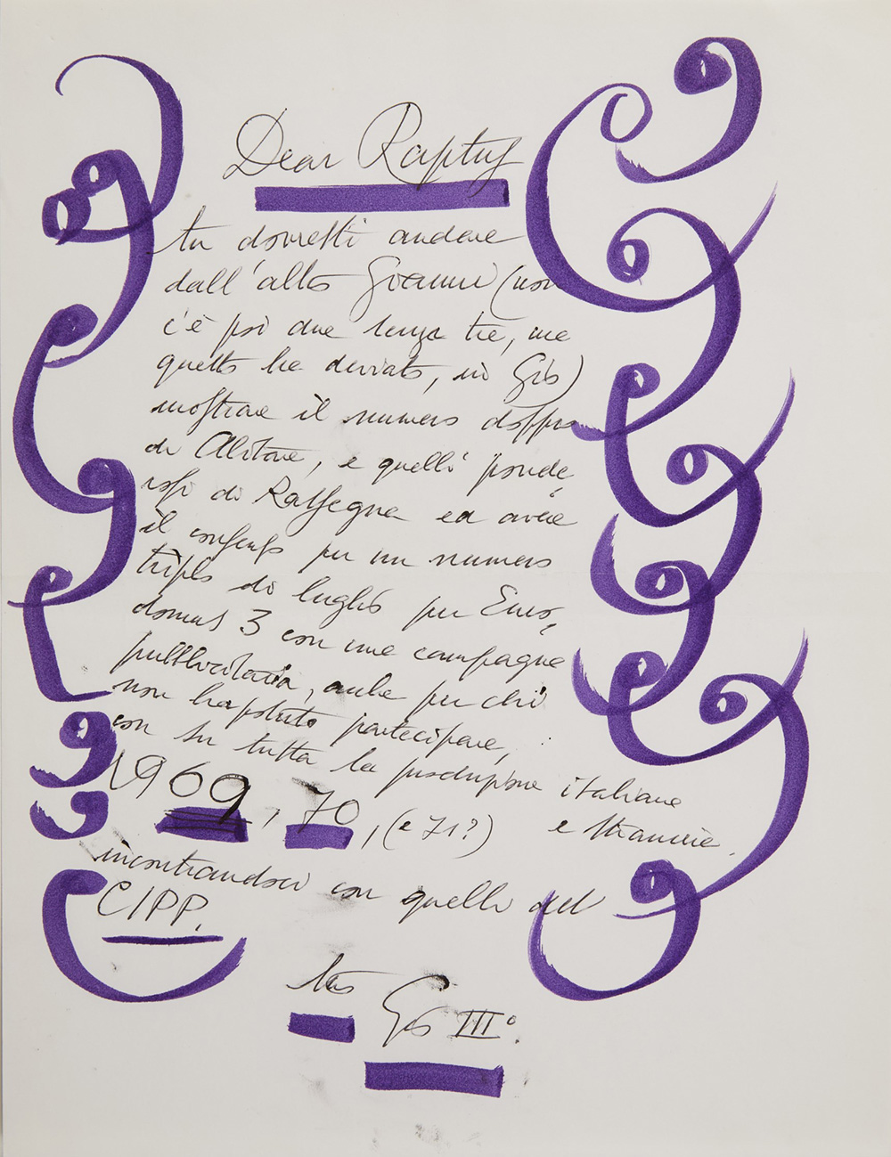 Gio Ponti (Milano 1891 - 1979) Lettera autografa con disegni monocromi, inviata a Giovanni Ratto, membro della redazione della rivista "Domus". Non locata, non datata [1969-70]. Inchiostro nero e pennarello viola su carta (cm 29,7x21) Provenienza: collezione privata, Milano Autograph letter with monochrome drawings for Giovanni Ratto, member of "Domus" magazine (cm 29,7x21) Provenance: private collection, Milano