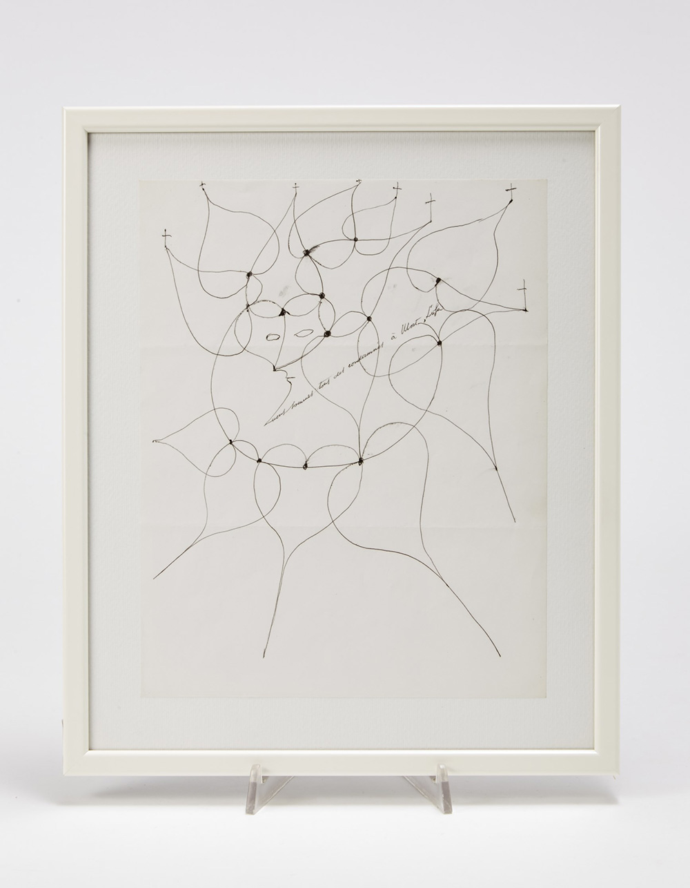 Gio Ponti (Milano 1891 - 1979) Disegno raffigurante volto di donna con frase autografa: "Nous sommes tous des condamnÈs ‡ mort, Lisa". In cornice (cm 27,5x22) Provenienza: collezione privata, Milano Drawing depicting a feminine face, with the phrase: "Nous sommes tous des condamnÈs ‡ mort, Lisa". Framed (cm 27,5x22) Provenance: private collection, Milan