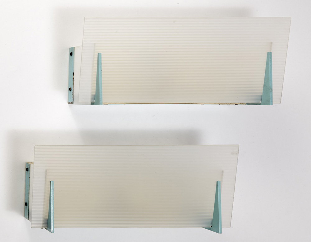 Pierre Paulin & Disderot (attribuito) Coppia di appliques in metallo perforato laccato bianco e vetro opalino. Possibile produzione Pierre Disderot, Francia, anni 60 (cm 38x17,5x12,5) (difetti) A pair of appliques. Lacquered metal and glass. France,1960s (cm 38x17,5x12,5) (defects)