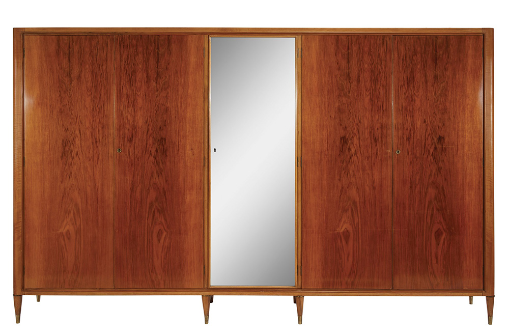 Paolo Buffa (Milano 1903 - 1970) Armadio a cinque ante impiallacciato in legno con gambe rastremate e puntali in ottone. Esecuzione Serafino Arrighi, Cant˘. Sec XX (cm 302x185x63) (lievi difetti) Accompagnato da certificazione di autenticit‡ dell'Archivio Paolo Buffa A wardrobe. Walnut and brass. Made by Serafino Arrighi, Cant˘, XX century (cm 302x185x63) (minor defects) Comes with the expertise issued by The Paolo Buffa Archives