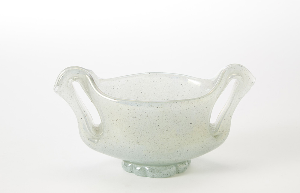 Ercole Barovier ( 1889 - 1974) Coppa biansata in vetro soffiato "Eugeneo" bianco opalescente perlaceo, colorato a caldo senza fusione e con superficie iridata. Murano 1951 ca. (h cm 14,5) Bibliografia per esemplari simili: Art of Barovier. Glassmarkers in Murano 1866-1972, a cura di M. Barovier, Arsenale, Venezia 1993, pp. 129, 131; AA.VV., L'arte del vetro. Silice e fuoco: vetri del XIX e XX secolo, Marsilio, Venezia 1992, p. 261 Glass bowl "Eugeneo". Murano, circa 1951 (h cm 14,5) Bibliography: Art of Barovier. Glassmarkers in Murano 1866-1972, a cura di M. Barovier, Arsenale, Venezia 1993, pp. 129, 131; AA.VV., L'arte del vetro. Silice e fuoco: vetri del XIX e XX secolo, Marsilio, Venezia 1992, p. 261