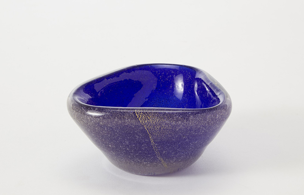 Seguso Vetri d'Arte (attribuito) Ciotola in vetro sommerso blu a bollicine con inclusione di foglia d'oro. Murano, anni 30-40. Firmato all'acido sotto la base "Veronese" (h cm 6) Blue glass bowl with golden leaf. Murano 1930s/40s. Signed under the base "Veronese" (h cm 6)