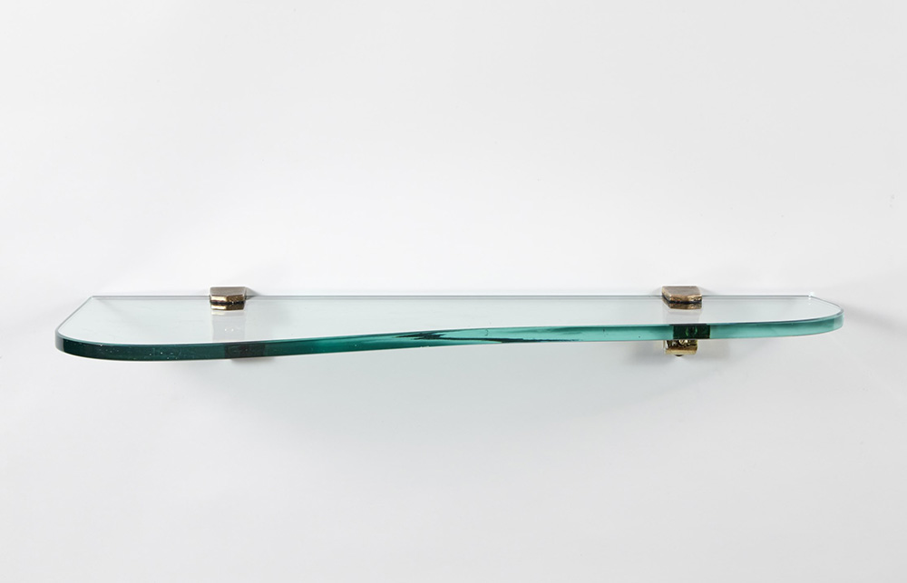 Fontana Arte Mensola in cristallo molato di forma asimmetrica stondata. Milano, anni 50. Accompagnata da supporti in ottone a pinza (cm 73x22) A crystal shelf. Milan, 1950s. With brass components (cm 73x22)