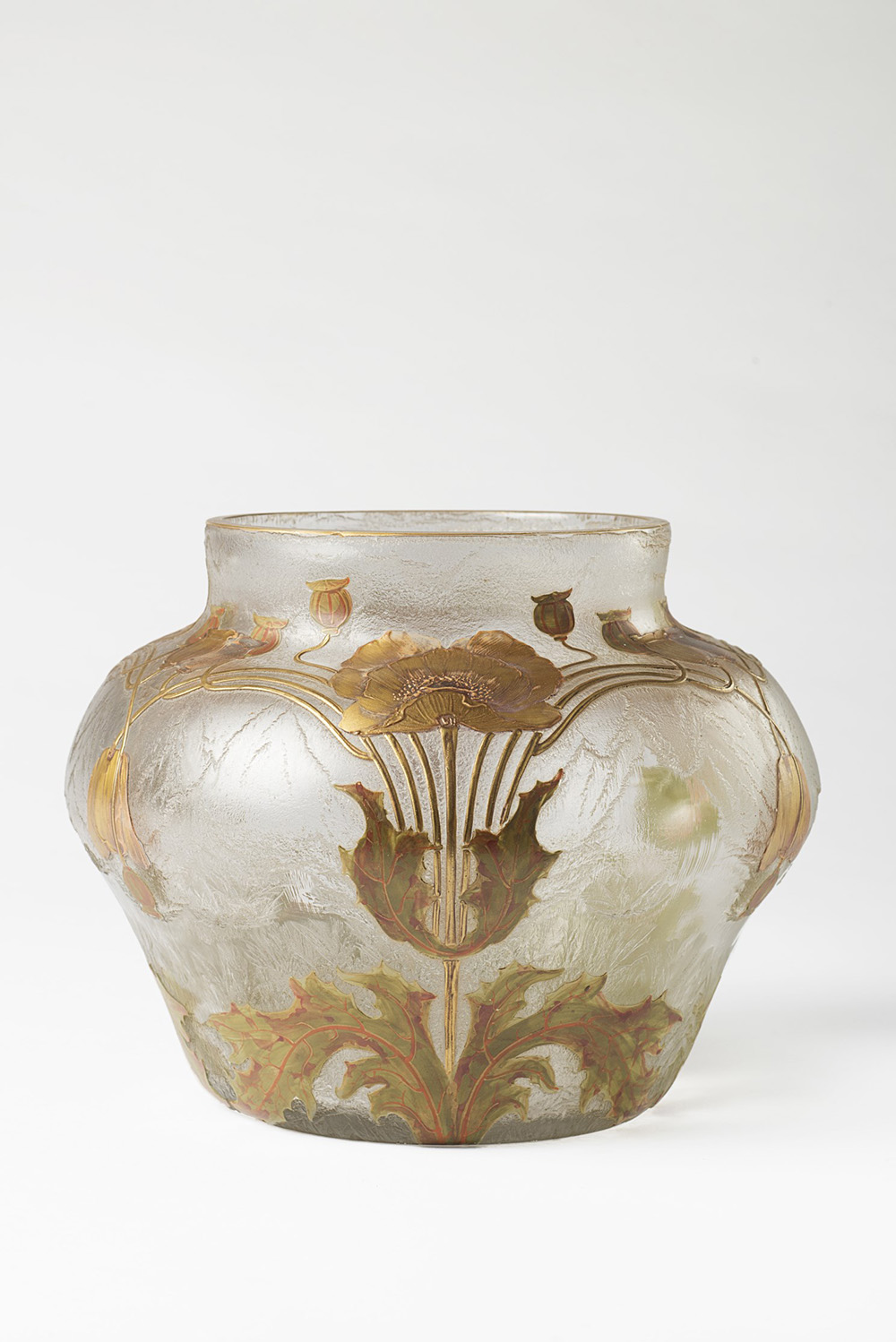 Manifattura di Mont Joye Vaso in vetro incolore inciso all'acido e decorato...