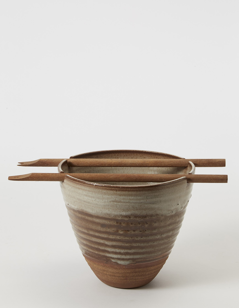 Nanni Valentini (Sant'Angelo In Vado 1932 - 1985) Ciotola in grËs lavorato al tornio e parzialmente smaltato in bianco-grigio e bruno, corredata da due bacchette di legno alloggiate in incavi sull'orlo. Arcore, anni 70 (h cm 25, d cm 25) Provenienza: Collezione Lino Sabattini, Bregnano GrËs bowl with two sticks. Arcore, 1970s (h cm 25, d cm 25) Provenance: Collezione Lino Sabattini, Bregnano
