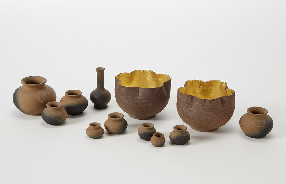 Nanni Valentini (Sant'Angelo In Vado 1932 - 1985) Lotto composto da un gruppo di dieci piccole anfore in terracotta, Arcore, anni 70 (h max cm 6) unito a due ciotole in grËs con interno dorato di manifattura giapponese (h cm 6, d cm 9) (difetti) Provenienza: Collezione Lino Sabattini, Bregnano Lot comprising ten little terracotta amphoras, Arcore, 1970s (h max cm 6) and two little Japanese bowls (h cm 6, d cm 9) (defects) Provenance: Collezione Lino Sabattini, Bregnano