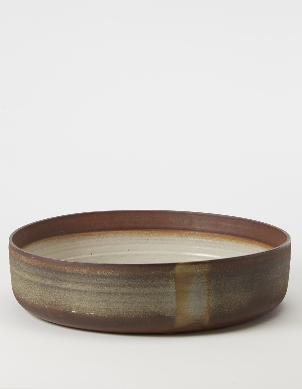 Nanni Valentini (Sant'Angelo In Vado 1932 - 1985) Grande vaso in grËs lavorato al tornio e parzialmente smaltato in bianco-crema e nei toni dellíocra e del verde chiaro. Manifattura Ceramica Arcore, anni 70. Marcato "CA" sotto la base (h cm 12,5 d cm 48) Provenienza: Collezione Lino Sabattini, Bregnano Big grËs vase. Manufactured by Ceramica Arcore, 1970s. Marked "CA" under the base (h cm 12,5 d cm 48) Provenance: Collezione Lino Sabattini, Bregnano
