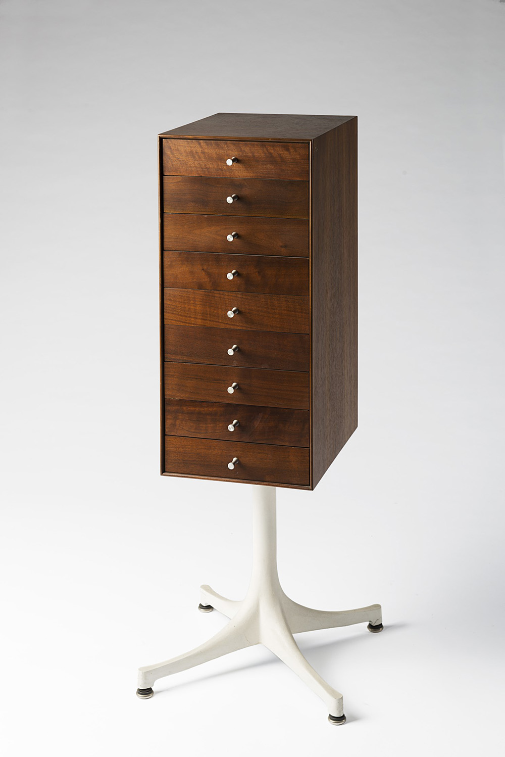 George Nelson (Chicago 1908 - Barrington 1986) Cassettiera verticale a nove cassetti della serie "Miniature Chests". Produzione Herman Miller, disegno 1952, commercializzazione 1952-1963. Alluminio pressofuso verniciato bianco, palissandro indiano e ottone nichelato (cm 26x97x53) (lievi difetti) Bibliografia: "Ottagono", n. 1, aprile 1966, p. 94; AA.VV. George Nelson Architect, Writer, Designer, Teacher, Vitra Design Museum, Weil am Rein 2008, p. 245 Nine drawers dresser from the series "Miniature Chests". Produced by Herman Miller, designed 1952. Aluminium, Indian rosewood, brass (cm 26x97x53) (minor defects) Bibliography: "Ottagono", n. 1, aprile 1966, p. 94; AA.VV. George Nelson Architect, Writer, Designer, Teacher, Vitra Design Museum, Weil am Rein 2008, p. 245