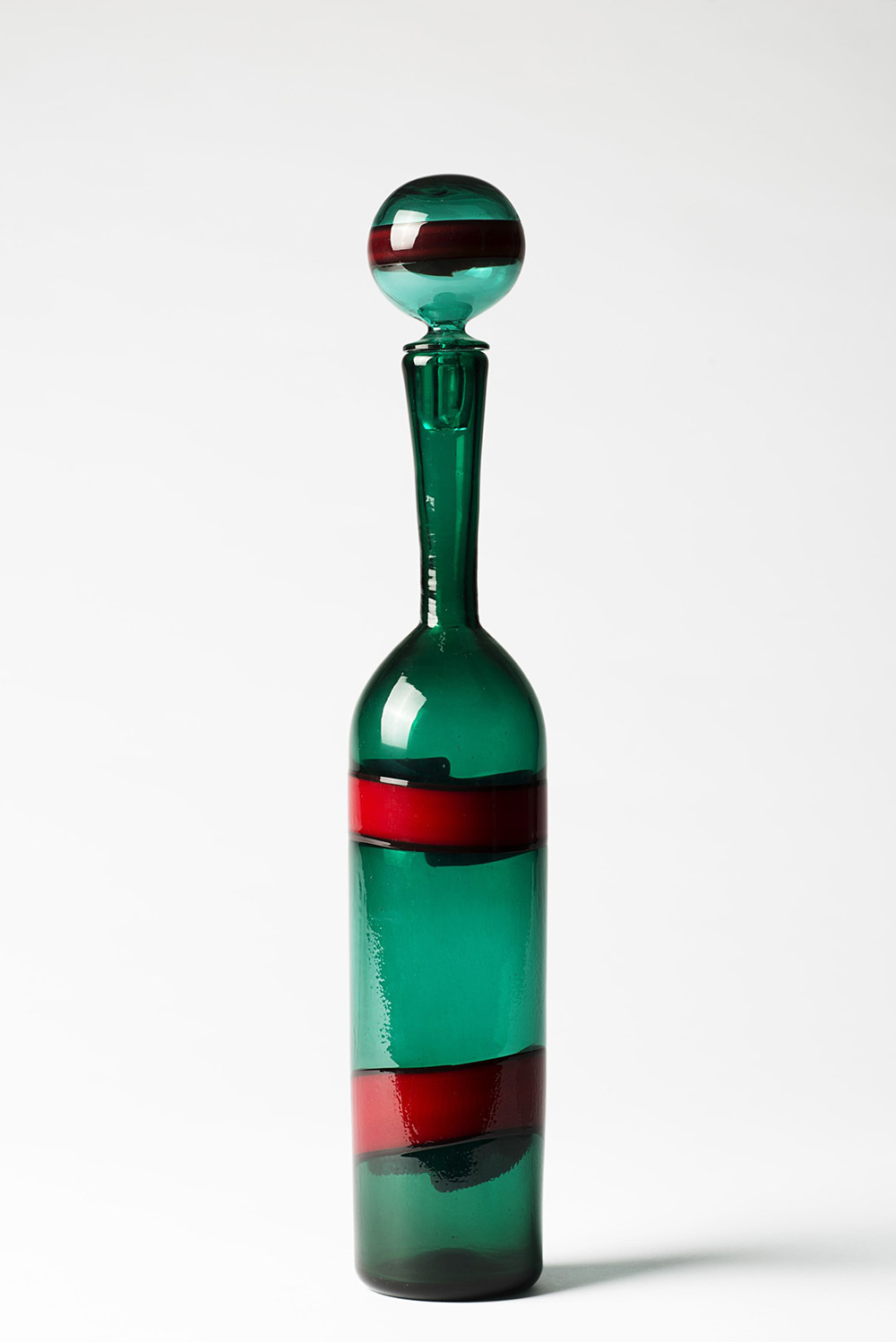 Fulvio Bianconi ( 1915 - 1996) Bottiglia con collo allungato della serie a fasce orizzontali. Venini, Murano 1953-56 ca. Firma all'acido sotto la base. Vetro soffiato trasparente verde con fasce orizzontali rosso opaco. Disegno n 4582 del catalogo rosso Venini (h cm 45,5 con tappo) (lievi difetti) Bibliografia: Fulvio Bianconi alla Venini, a cura di M. Barovier e C. Sonego, Skira, Milano 2015, p. 202; F. Deboni, I vetri Venini. la storia, gli artisti, le tecniche, Allemandi, Torino 2007 Glass bottle. Venini, Murano, circa 1943-56. Signed under the base. Design n. 4582, Catalogo Rosso Venini (h cm tot 45,5) (minor defects) Bibliography: Fulvio Bianconi alla Venini, a cura di M. Barovier e C. Sonego, Skira, Milano 2015, p. 202; F. Deboni, I vetri Venini. la storia, gli artisti, le tecniche, Allemandi, Torino 2007