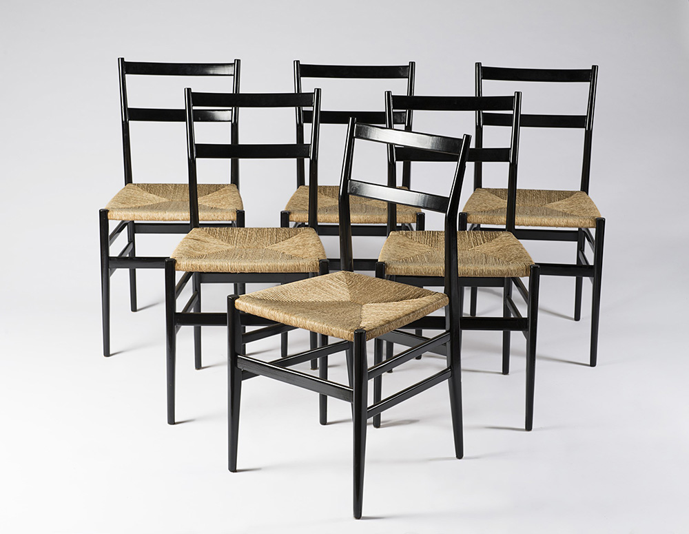Gio Ponti (Milano 1891 - 1979) Sei sedie modello "646 Leggera", Produzione Cassina, Milano, 1951. Struttura in frassino tinto nero e seduta impagliata (cm 42x83x47) (lievi difetti) Bibliografia: "Domus", n. 264-265, dicembre 1951, p. 15; Centrokappa, Il design italiano degli anni 50, Ricerche Design Editrice, Milano 1985, p. 109; Gio Ponti designer, Alinea, Firenze 2007, p. 28; L. Falconi, Gio Ponti. Interior Objects Drawings 1920-1976, Electa, Milano 2010, p. 242 Six "646 Leggera" chairs. Produced by Cassina, Milan, 1951. Ash and straw (cm 42x83x47) (minor defects) Bibliography: "Domus", n. 264-265, dicembre 1951, p. 15; Centrokappa, Il design italiano degli anni 50, Ricerche Design Editrice, Milano 1985, p. 109; Gio Ponti designer, Alinea, Firenze 2007, p. 28; L. Falconi, Gio Ponti. Interior Objects Drawings 1920-1976, Electa, Milano 2010, p. 242