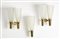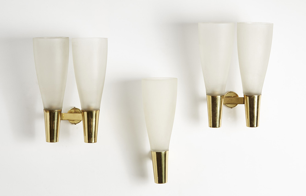 Pietro Chiesa - Gruppo di tre lampade da parete a una e due luci modello "1537". Produzione Fontana Arte, Milano, disegno 1936 ca, esecuzione anni 50. Ottone e vetro satinato (h cm 29) (difetti a un vetro e mancante di un supporto a muro)