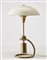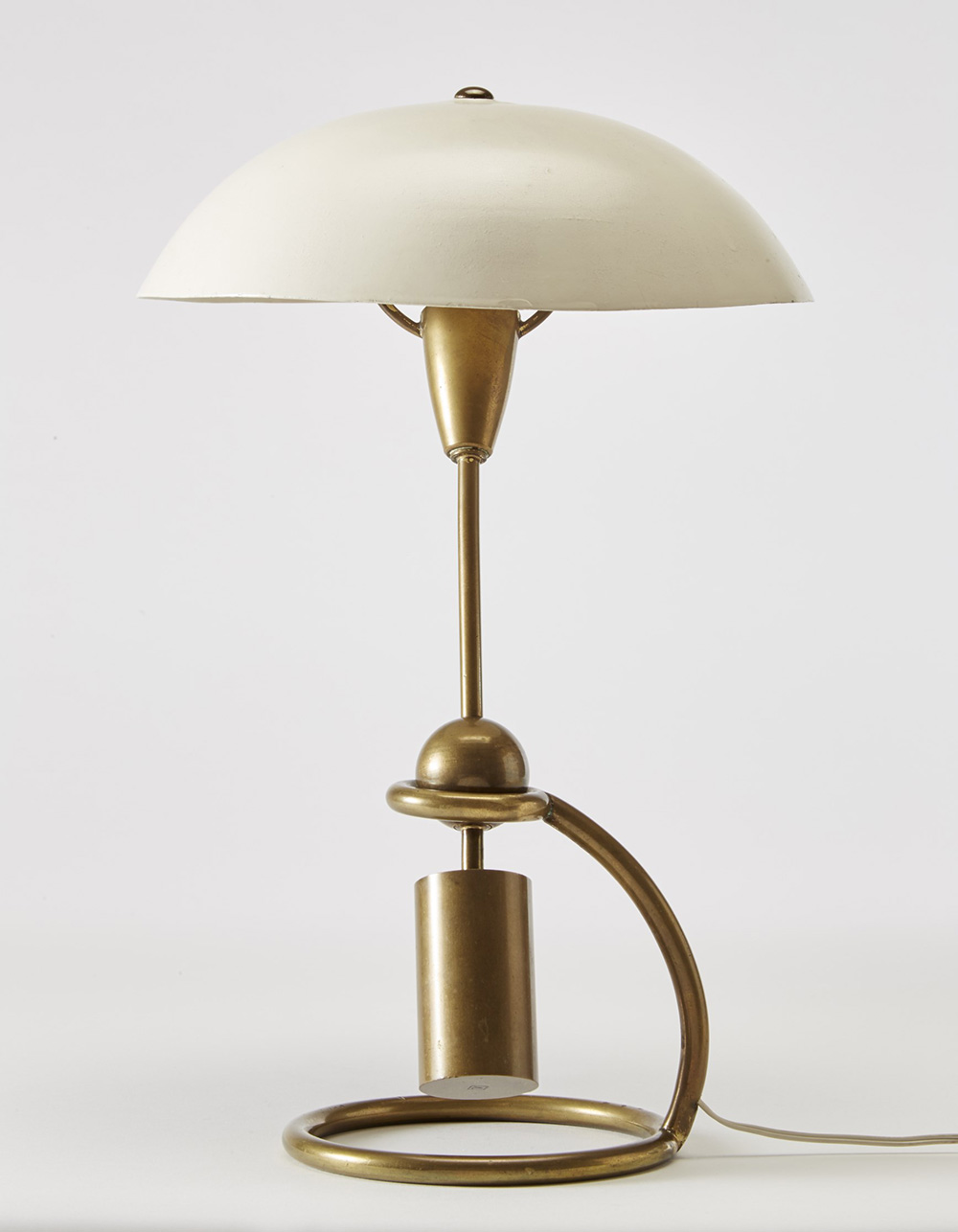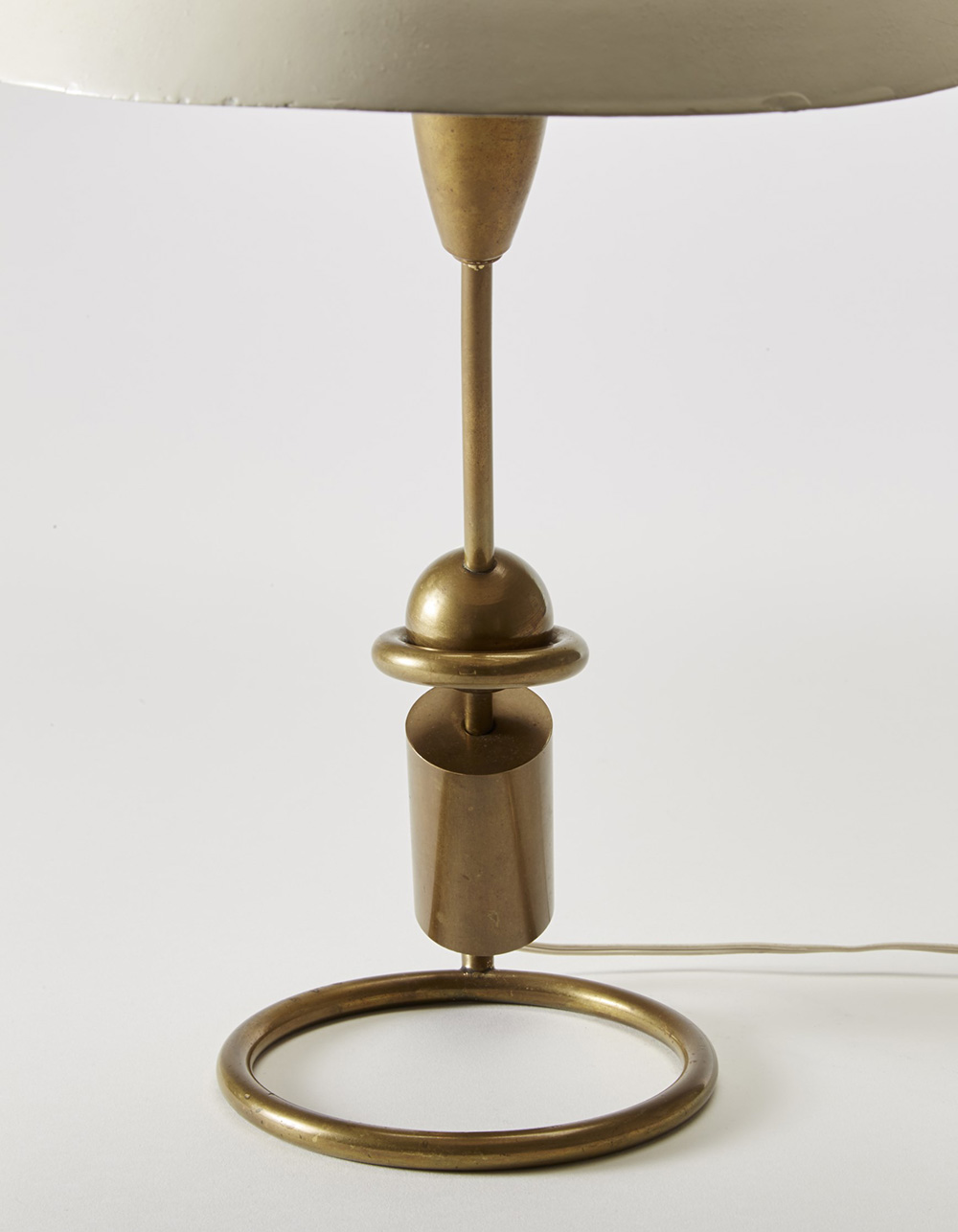 Angelo Lelii ( 1911 - 1979) Lampada da tavolo orientabile a bilanciere. Produzione Arredoluce, Monza, anni 50. Struttura in ottone e alluminio laccato bianco. Marchio "AL" incusso sotto la base del bilanciere (h max cm 40) (lievi difetti) Esemplare autenticato presso l'Archivio Arredoluce con il codice 8604299 Table lamp . Produced by Arredoluce, Monza, 1950s. Brass and white lacquered aluminium. Marked "AL" under the base (h max cm 40) (minor defects) Registered with Archivio Arredoluce, code n. 8604299