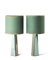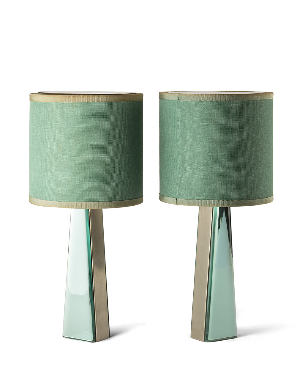 Fontana Arte Coppia di lampade da tavolo modello "2374". Milano, fine anni 60. Fusto in ottone nichelato satinato e cristallo verde specchiato e molato, paralume in canapa colorata verde (d cm 16, h cm 35) Bibliografia: "Quaderni Fontana arte" n. 7, 1964, p. 35 A pair of table lamps model "2374". Mialn ,late 1960s. Brass and green crystal, green hemp lampshades (d cm 16, h cm 35) Bibliography: "Quaderni Fontana arte" n. 7, 1964, p. 35