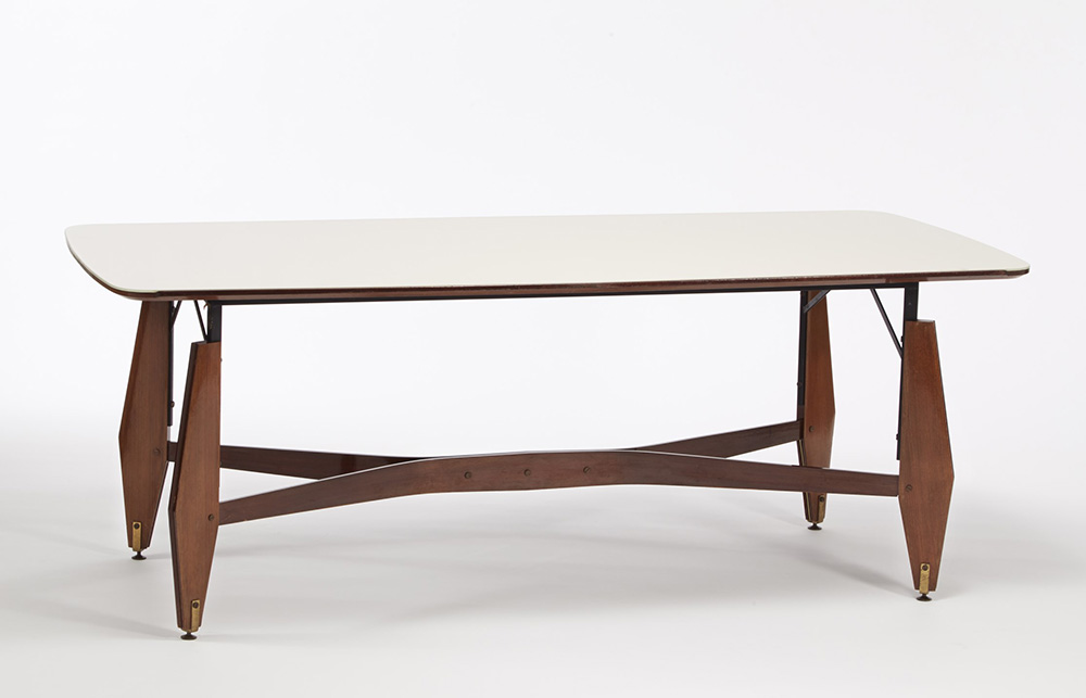 Melchiorre Bega ( 1898 - 1976) Tavolo con struttura in metallo verniciato nero e in legno, piano in vetro retroverniciato, minuterie in ottone. Produzione Altamira, Italia, anni 60 (cm 207x77x96) (lievi difetti) Table. Varnished metal, glass, brass. Produced by Altamira, Italia, 1960s (cm 207x77x96) (minor defects)
