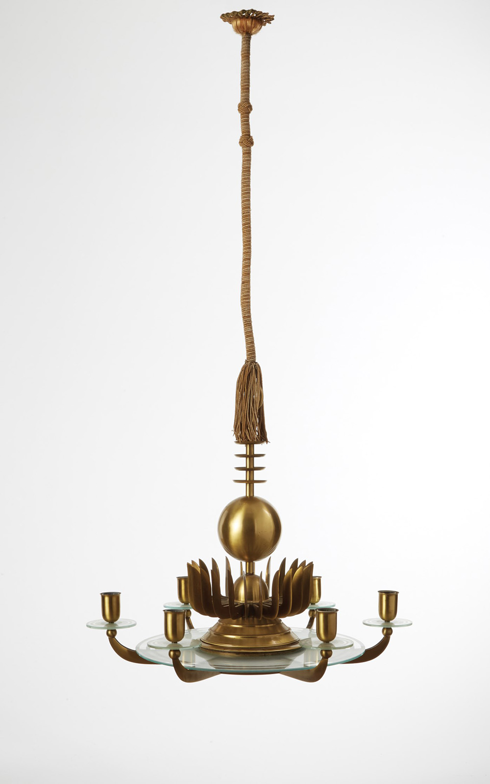 Paolo Buffa (Milano 1903 - 1970) Lampadario a sei braccia con struttura in ottone, disco centrale e piattelli in vetro con decori incisi a getto di sabbia. Esecuzione Ditta Achille Donzelli, Milano, anni 30 (h cm 140, d cm 77) (lievi difetti alla struttura in ottone) Bibliografia: "Domus", n. 75, marzo 1934, p. 10 Accompagnato da certificazione di autenticit‡ dell'Archivio Paolo Buffa Ceiling lamp. Brass and glass. Ditta Achille Donzelli, Milan, 1930s. (h cm 140, d cm 77) (minor defects on the brass) Bibliography: Domus, n. 75, marzo 1934, pag. 10 Comes with the expertise from the Archivio Paolo Buffa