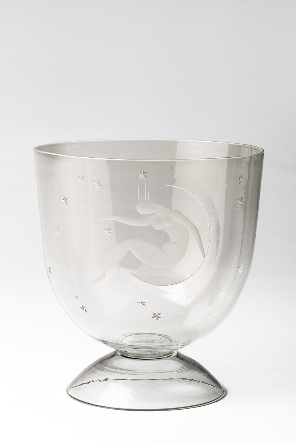 Salir Coppa in vetro incolore con incisioni alla ruota raffiguranti una silhouette femminile e stelle. Incisioni di Franz Pelzel su disegno di Guido Balsamo Stella. Murano, seconda met‡ del sec XX (h cm 16,7) A glass bowl. Engraving made by Franz Pelzel, design made by Guido Balsamo Stella. Murano, second half of the XX century (h cm 16,7)
