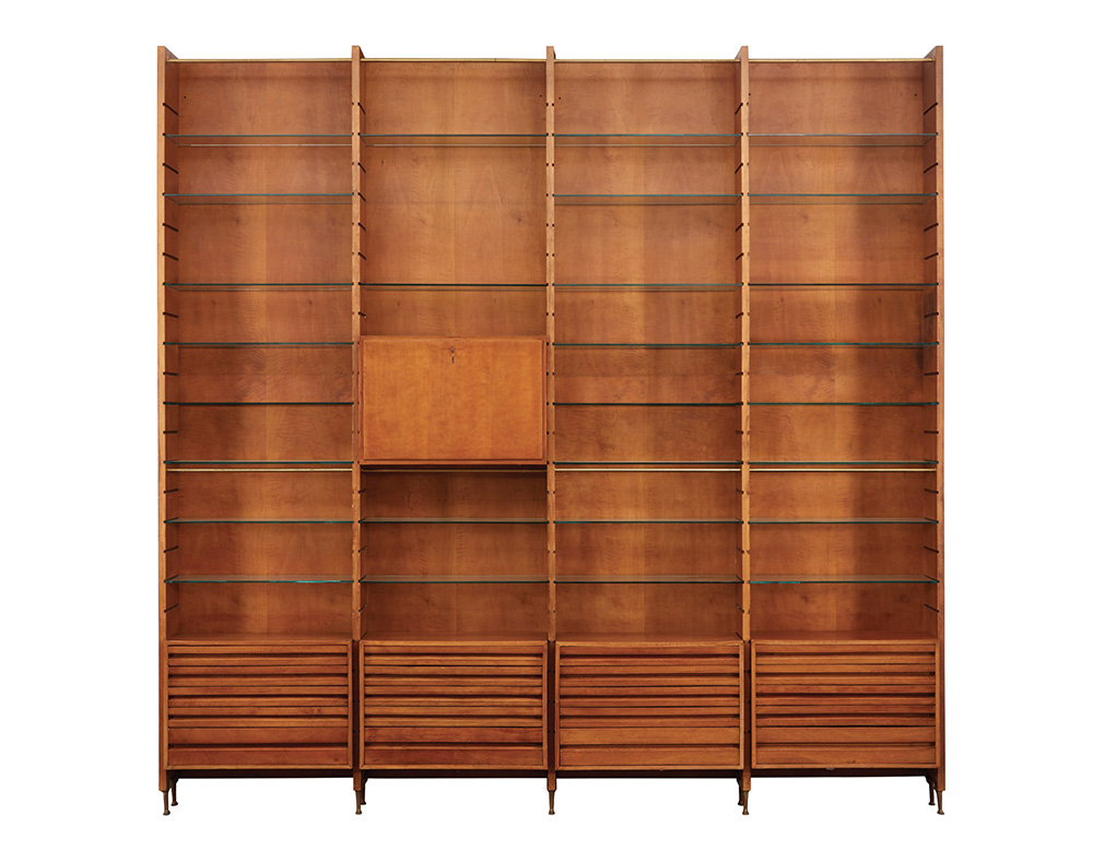 BBPR (Lodovico Barbiano di Belgiojoso, Enrico Peressutti, Ernesto Nathan Rogers) Libreria a quattro moduli e venti cassetti con montanti in legno di noce, schienali impiallacciati, uno stipo a ribalta, piani in cristallo molato e piedini in fusione di ottone. Esecuzione Pierino Frigerio, Cant˘, fine anni 60 (cm310x300x35) (lievi difetti) Provenienza: Appartamento Z.P., Milano Bookcase. Walnut, crystal, brass. Made by Pierino Frigerio, Cant˘, late 1960s (cm310x300x35) (minor defects) Provenance: Apartment Z.P., Milano
