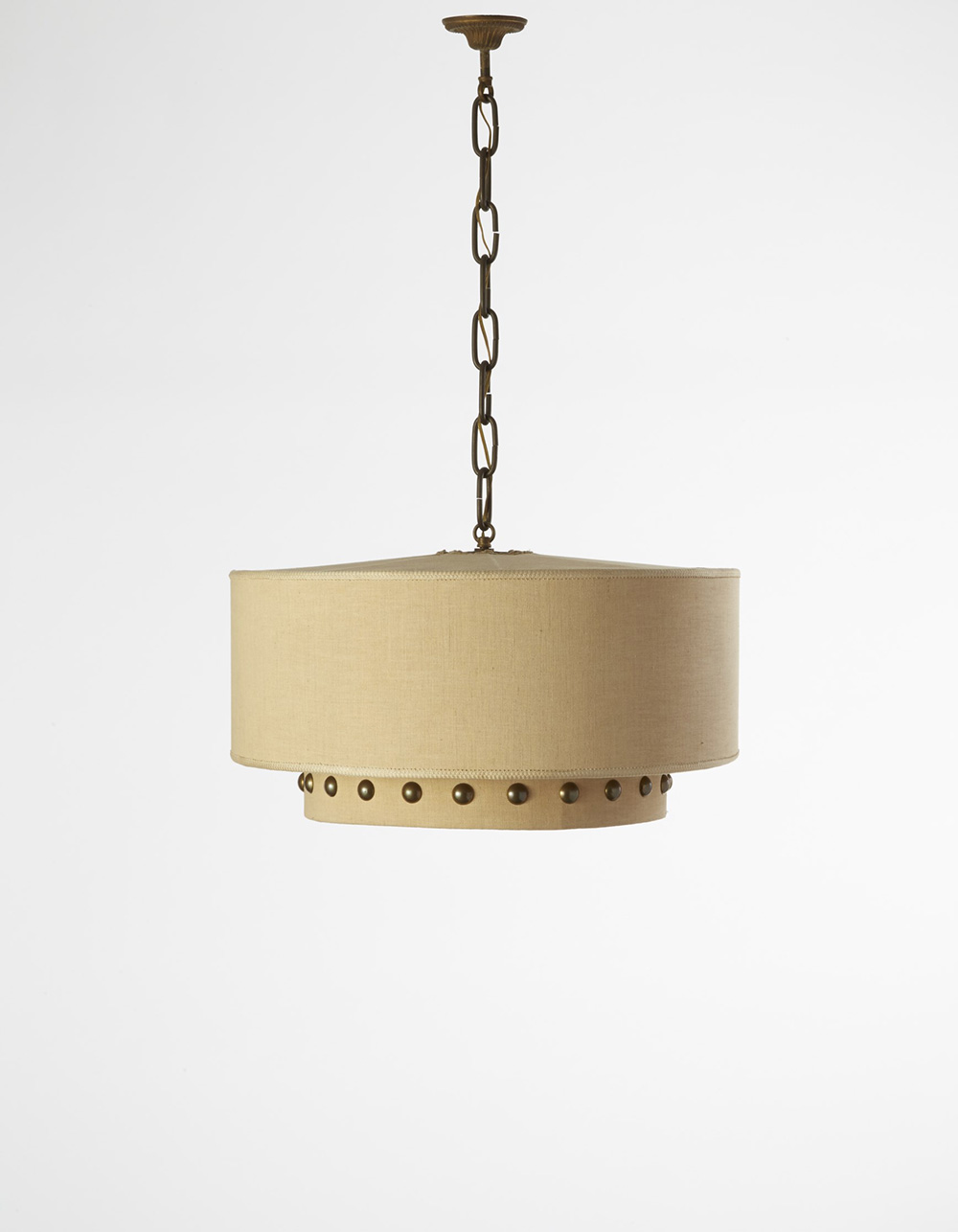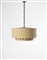BBPR (Gian Luigi Banfi, Lodovico Barbiano di Belgiojoso, Enrico Peressutti, Ernesto Nathan Rogers) (attribuito) Lampadario a tre luci con paralume in tela decorata a borchie, struttura in ottone. Milano, 1938 (d cm 51) (lievi difetti)