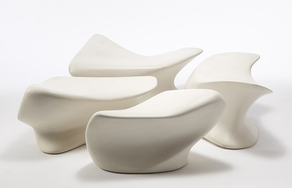 Zaha Hadid (Baghdad 1950 - Miami 2016) Quattro sgabelli modello "Nekton". Produzione Established & Sons, UK, 2006. Poliuretano bianco (l max cm 140) (difetti)