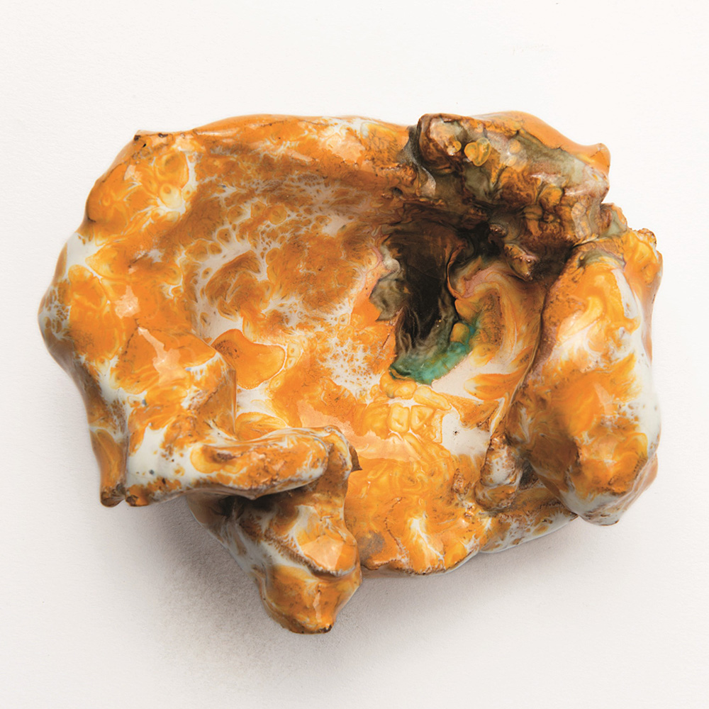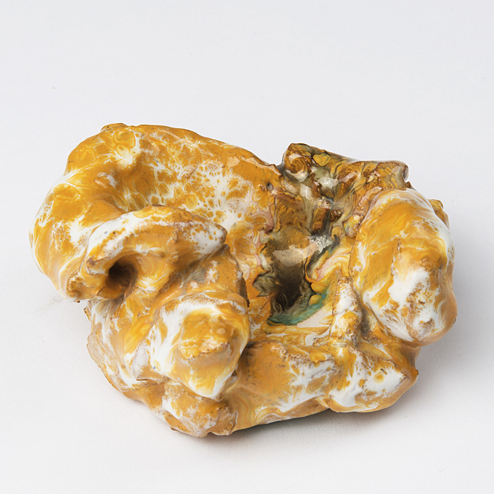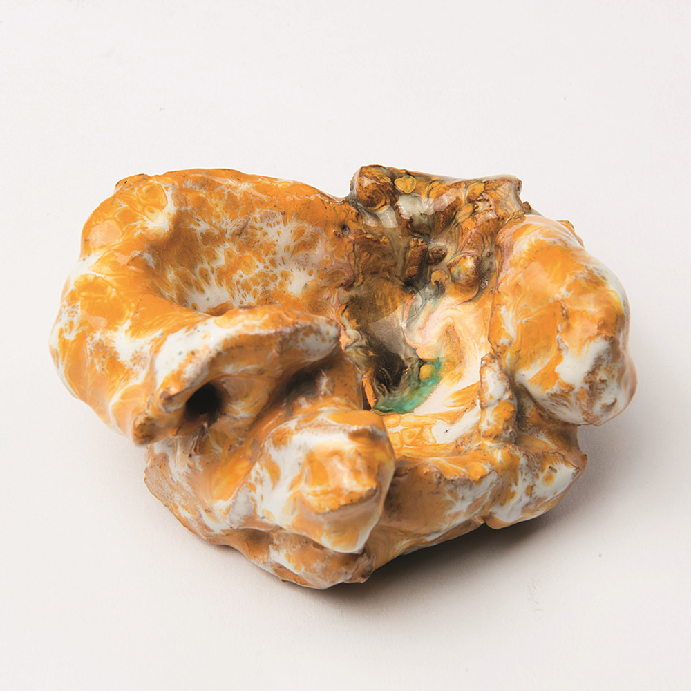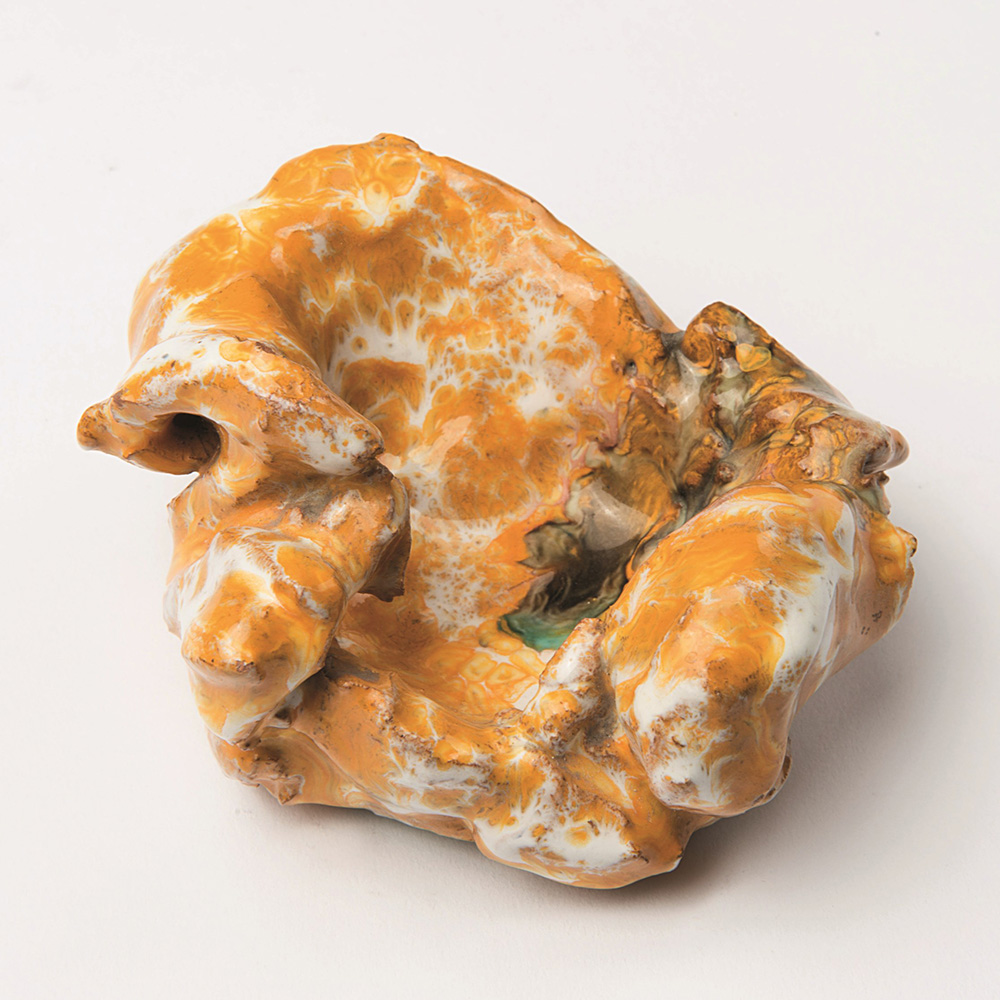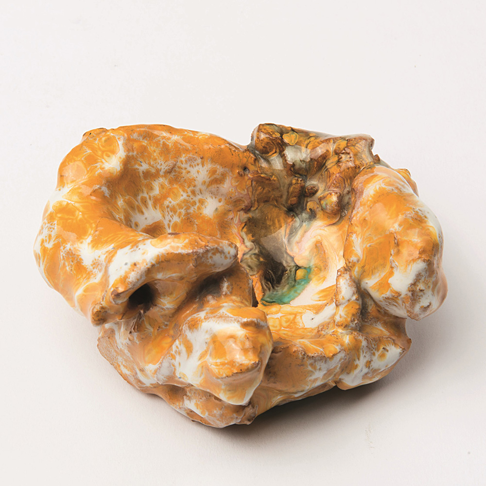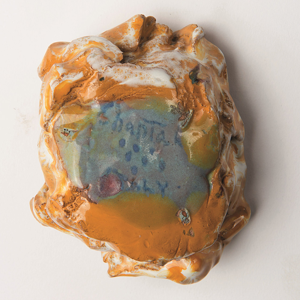 Fausto Melotti (Rovereto 1901 - Milano 1986) Piccola scultura informale in ceramica smaltata in giallo arancio e verde. Firmata in blu sotto la base "Chantal Italy" e con il monogramma dei setti punti (h cm 6) (lievi difetti) Opera registrata presso l'Archivio Fausto Melotti con il codice OPC 105 A little sculpture. Glazed ceramic. Signed under the base "Chantal Italy" with monogram (h cm 6) (minor defects) Registered with Fausto Melotti Archives with the code number "OPC 105"
