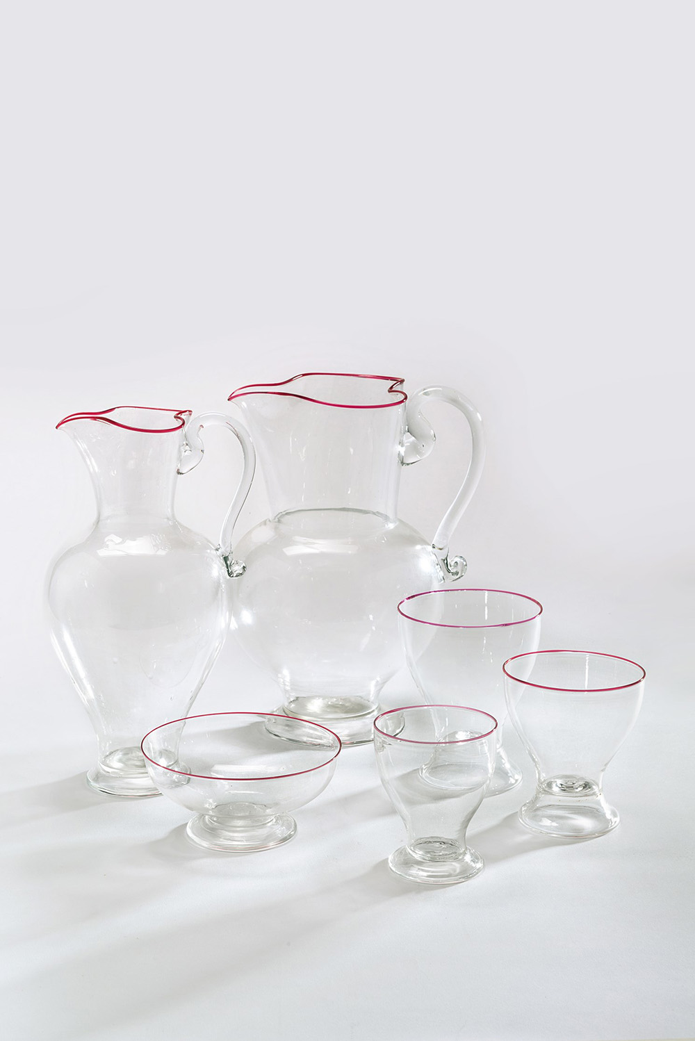 MVM Cappellin & C Servizio in vetro soffiato cristallo con orlo applicato in vetro rosso trasparente. Murano, fine anni 20. Composto da nove brocche, venticique coppette, ventritre bicchieri da liquore, venti bicchieri da acqua, ventuno bicchieri da vino e tre bicchieri di diversa dimensione (misure diverse) Crystal glass set. Murano, late 1920s.