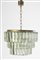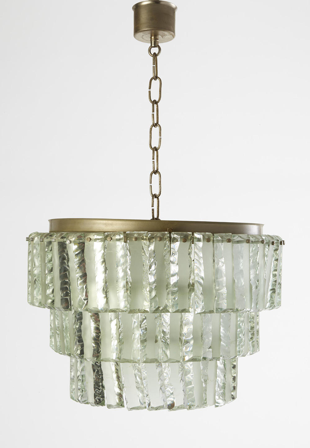Lampadario con struttura in metallo e pendenti a vetri scalpellati di forte spessore. Produzione italiana, anni 60 (d cm 53, h cm 75) (lievi difetti) Ceiling lamp. Metal structure, glass. Italy, 1960s (d cm 53, h cm 75)