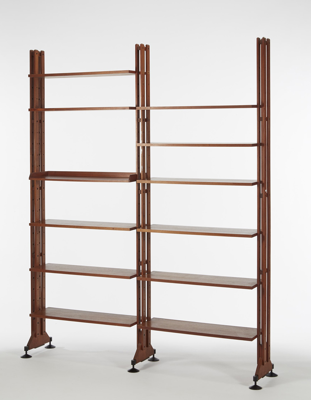 Franco Albini (1905 - 1977) e Franca Helg (1920 - 1989) Libreria a due moduli modello "LB10". Produzione Poggi, Pavia, 1958 ca. Legno massello, bordato e impiallacciato in teak, dodici retti da montanti autoportanti su piedi metallici regolabili (cm 176x217x38) (lievi difetti) Bibliografia: G. Gramigna, 1950-1980 repertorio: immagini e contributi per una storia dell'arredo italiano, Mondadori, Milano 1985, p. 125; Catalogo di Produzione Poggi, 1973, s.p. Bookcase model "LB 10". Produced by Poggi, Pavia, 1958 ca. Solid wood, veneered teak (cm 176x217x38) (minor defects) Bibliography: G. Gramigna, 1950-1980 repertorio: immagini e contributi per una storia dell'arredo italiano, Mondadori, Milano 1985, p. 125; Catalogo di Produzione Poggi, 1973, s.p.